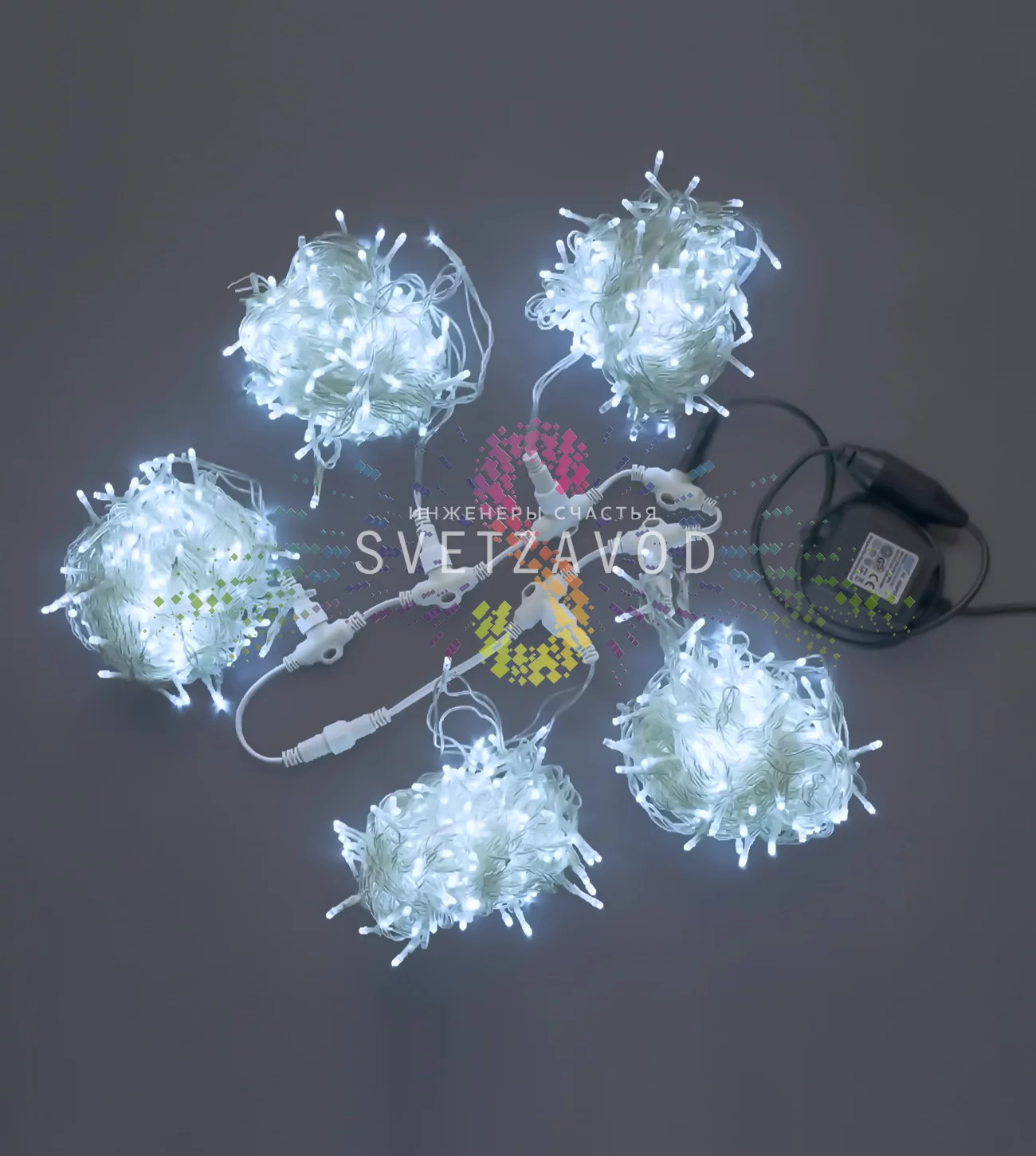 Гирлянда Спайдер спроектирована для простого монтажа и многолетней службы в российских условиях. Её основа — центральный узел с влагозащищенными разъемами, от которого расходятся 5 независимых лучей. Это позволяет подключать и распределять лучи по веткам дерева или архитектурным элементам по отдельности, что упрощает процесс украшения.