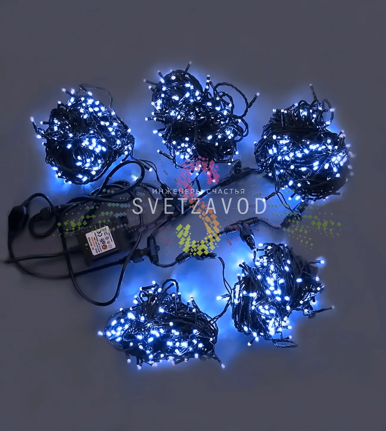 Гирлянда собрана по принципу «паука»: все пять лучей подключены к центральному разветвителю, что упрощает монтаж. Черный провод из ПВХ малозаметен днем и выдерживает уличные условия. Светодиоды DIP расположены каждые 10 см, обеспечивая равномерное свечение. Низковольтное питание 24В делает систему пожаробезопасной и экономичной (60 Вт на весь комплект). Степень защиты IP54 гарантирует работу под дождем и снегом.