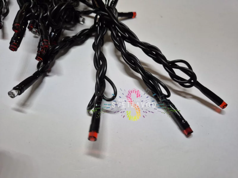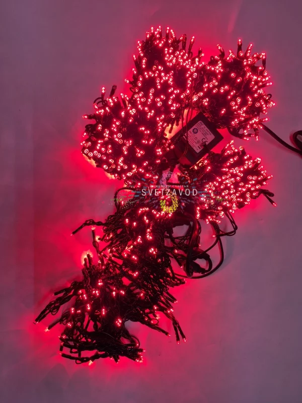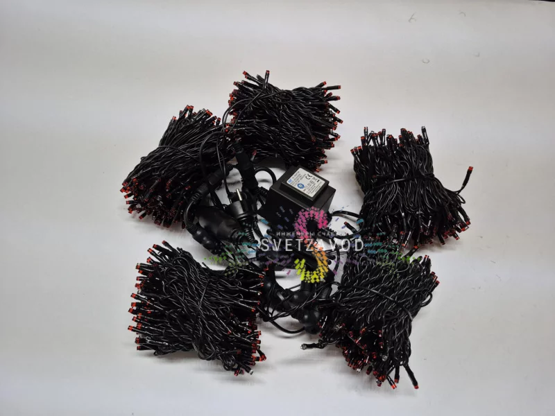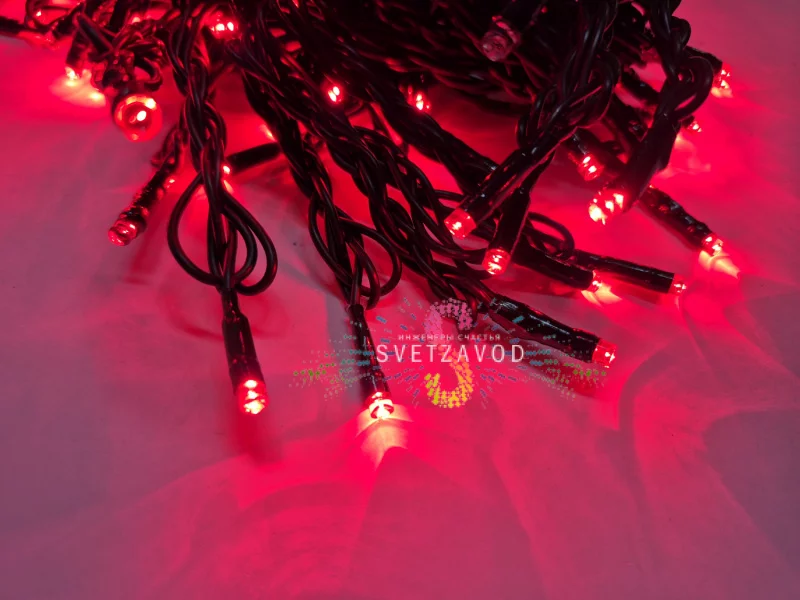 1000 ярких светодиодов типа DIP расположены с шагом 10 см. Ресурс работы — 40 000 часов. Даже при круглогодичном использовании на улице гирлянда прослужит несколько сезонов.