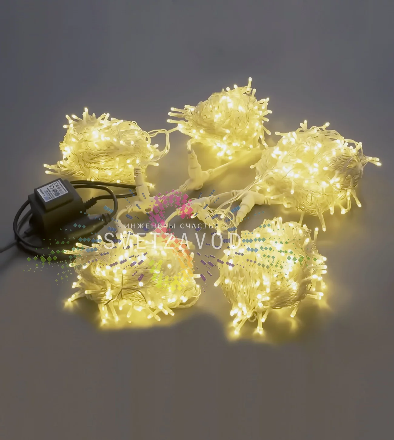 Ищете способ быстро и эффектно украсить раскидистое дерево, создать праздничную атмосферу у магазина или на дачном участке? Гирлянда Спайдер — это готовый комплект из пяти 20-метровых лучей, которые расходятся от центрального разветвителя, создавая объёмное сияние. Вам не нужно думать о подключении — блок питания 220/24В уже в комплекте. Мерцающий теплый белый свет на прозрачном проводе делает эту модель идеальной для создания волшебной, уютной атмосферы в любом месте.