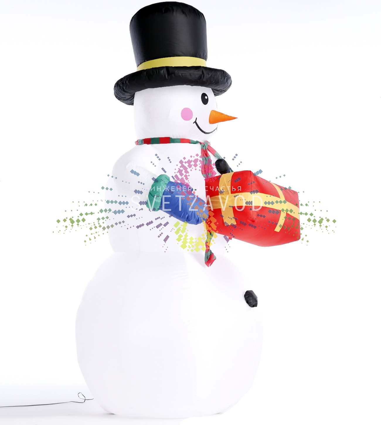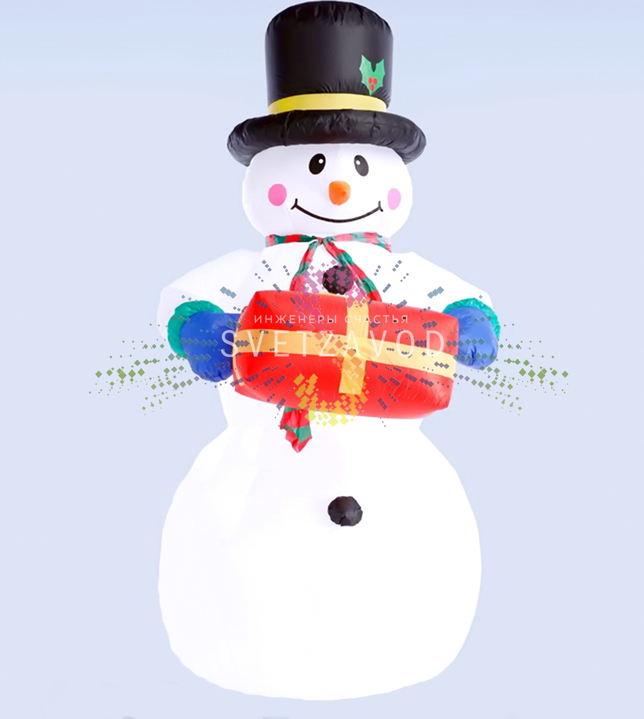 Объемный снеговик с подарком: Надувная фигура 3D Снеговик высотой 240 см создает потрясающий визуальный эффект и мгновенно преображает любое пространство. Снеговик держит в руках праздничный подарок, что добавляет композиции завершенности и новогоднего настроения. Фигура работает от безопасного напряжения 12В и комплектуется всем необходимым для немедленного использования.