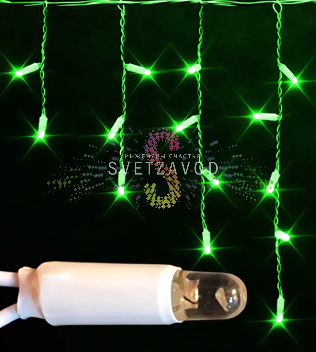 Конструкция бахромы включает горизонтальную шину длиной 3 метра, от которой отходят вертикальные нити длиной 20, 30, 40 и 50 см с шагом 10 см. Все 112 ярких зеленых светодиодов защищены колпачками.