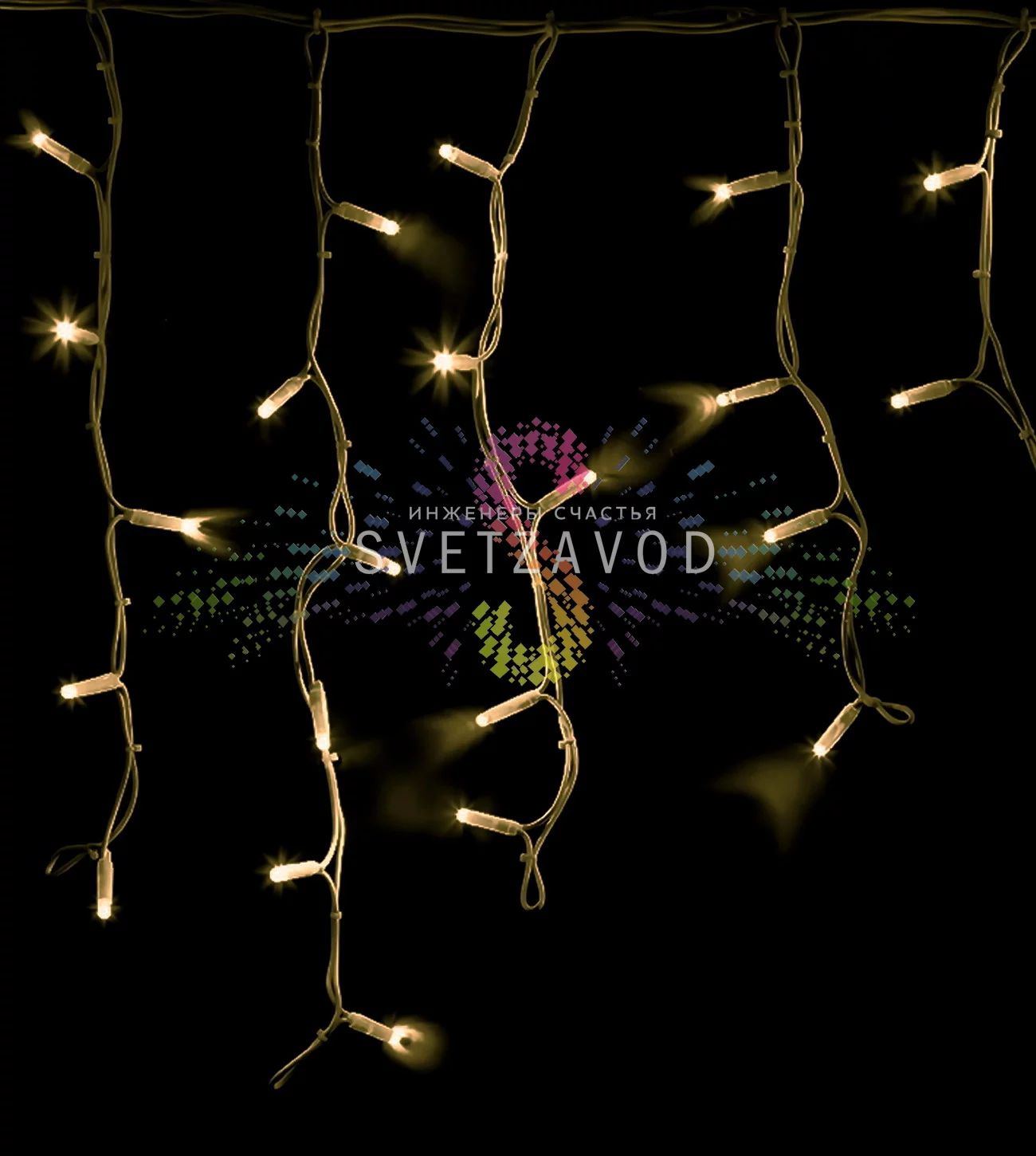 Конструкция представляет собой горизонтальную шину длиной 4,8 метра, от которой свисают вертикальные нити разной длины (от 10 до 60 см), формируя классический силуэт «сосульки». Встроенный контроллер обеспечивает эффект мерцания каждого пятого светодиода, создавая сложный визуальный рисунок без необходимости покупки дополнительного оборудования.