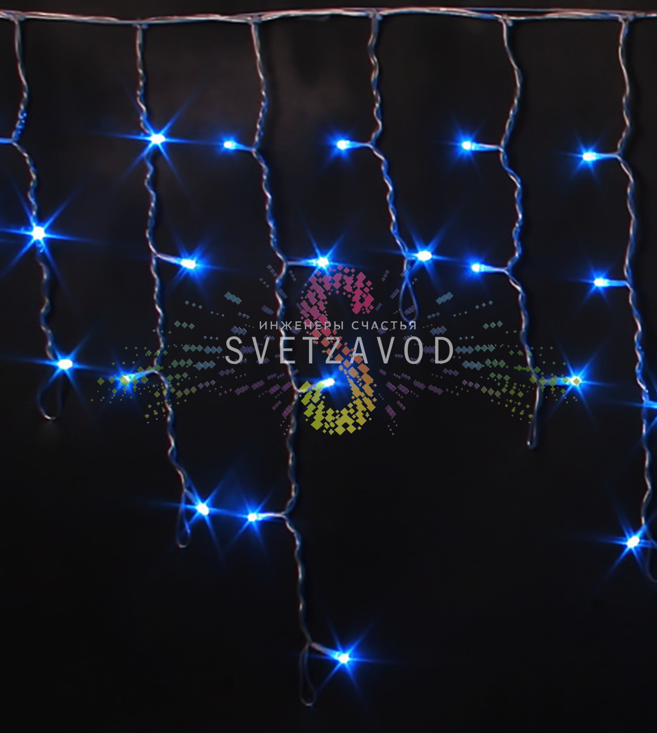 Конструкция включает основной горизонтальный кабель длиной 3 метра, от которого отходят вертикальные гирлянды общей длиной 0,5 метра. Светодиоды синего цвета равномерно распределены по подвескам, создавая эффект падающих сосулек или струй воды.
