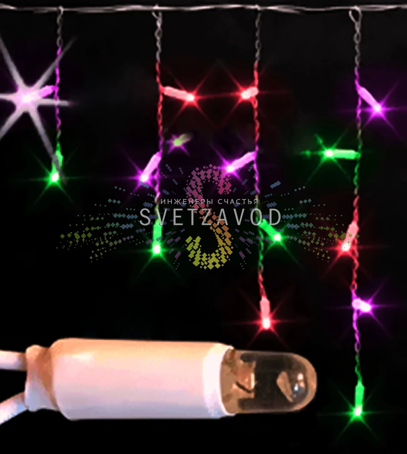 Гирлянда представляет собой горизонтальную шину с вертикальными нитями разной длины, имитирующими ледяные сосульки. Каждая седьмая нить мерцает, создавая динамичную игру света, что делает её особенно привлекательной для праздничного и коммерческого декора.