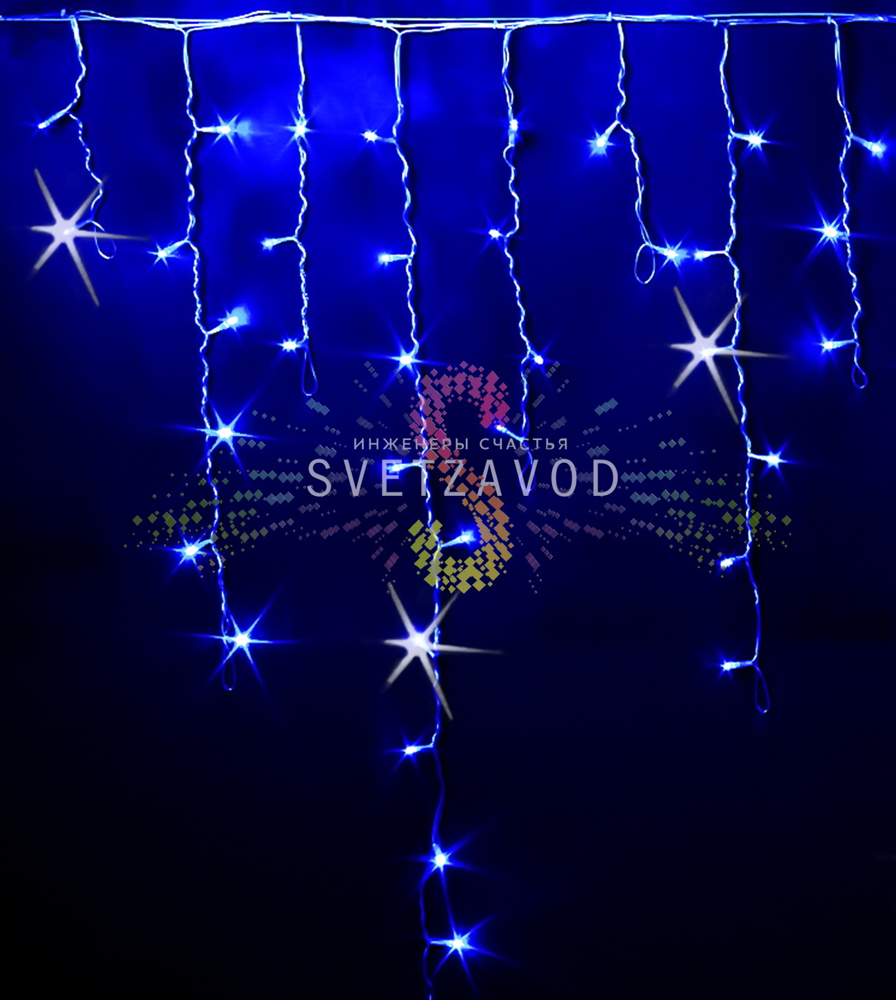 Технологическое превосходство: Основной горизонтальный кабель из прозрачного ПВХ с равномерно расположенными вертикальными гирляндами разной длины. Каждая нить оснащена качественными светодиодами синего цвета, один из которых на каждой нити мерцает белым светом, создавая уникальный трехмерный эффект.