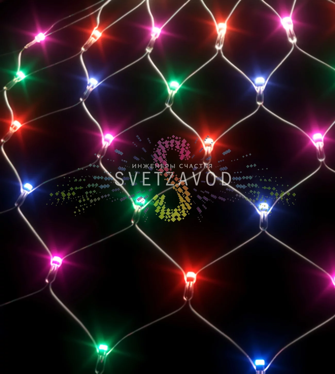 Сетка размером 2х3 метра с 384 яркими мультицветными (RGB) светодиодами создает миллионы оттенков. Прозрачный провод из ПВХ делает ее практически невидимой днем, а ночью она превращает любой объект в световое произведение искусства. Это отличный выбор, чтобы купить уличную светодиодную сетку для сада или фасада.