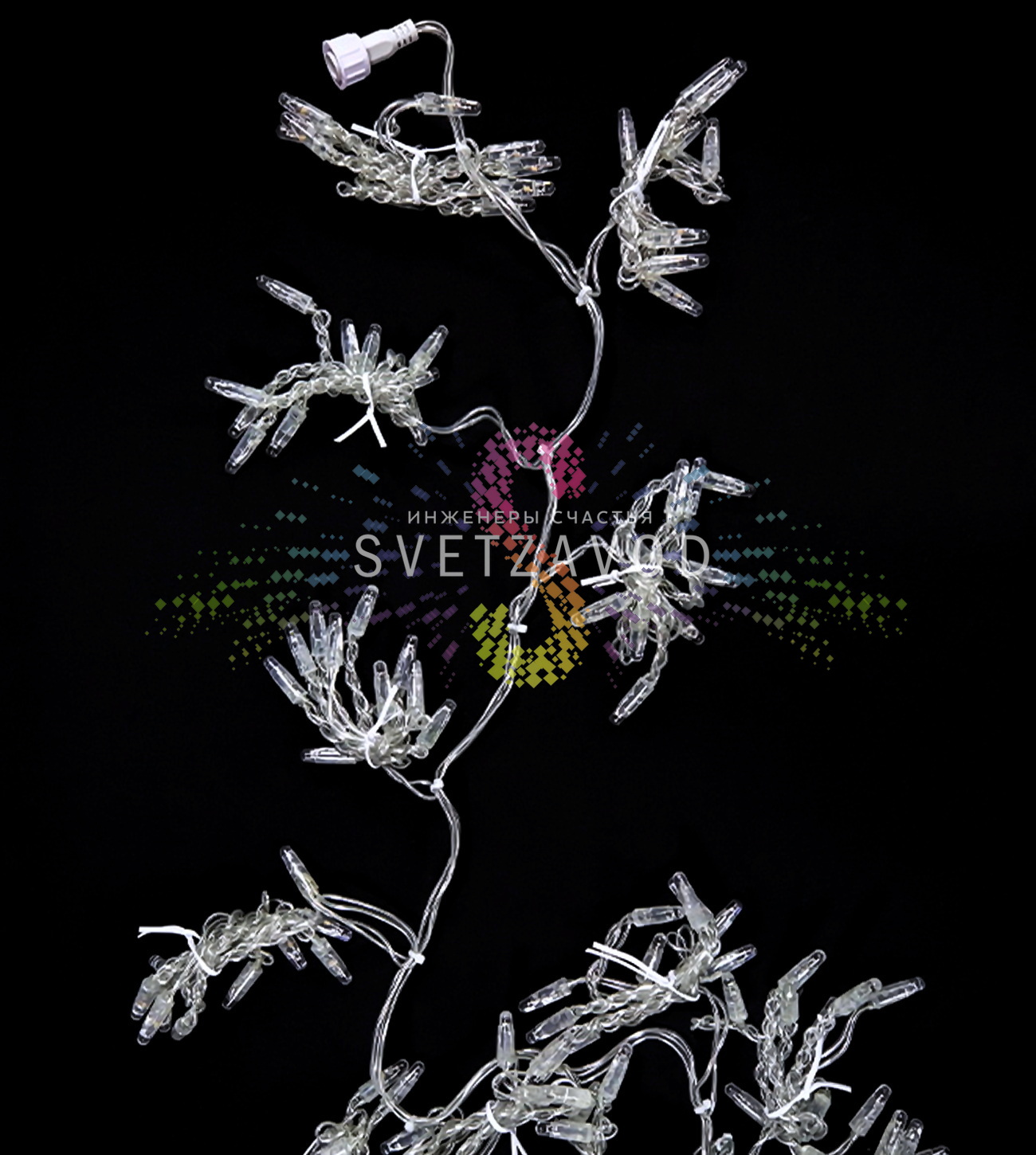 Надежность и долговечность: Конструкция с фиксированными нитями обеспечивает стабильную работу и защиту от повреждений. Прозрачный ПВХ-кабель практически незаметен при выключенном состоянии, создавая эффект парящих светящихся капель.