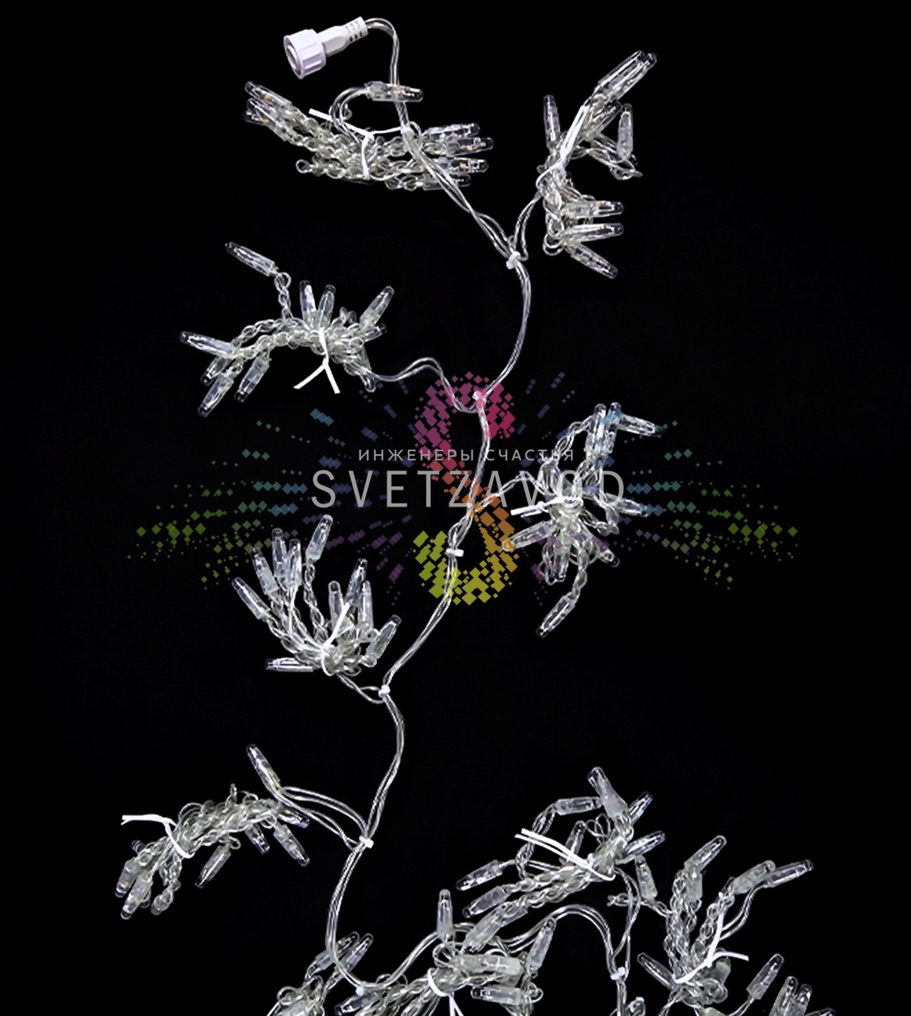 Провода выполнены в прозрачной ПВХ-оболочке, что делает их малозаметными при монтаже и усиливает визуальный эффект "светового дождя".