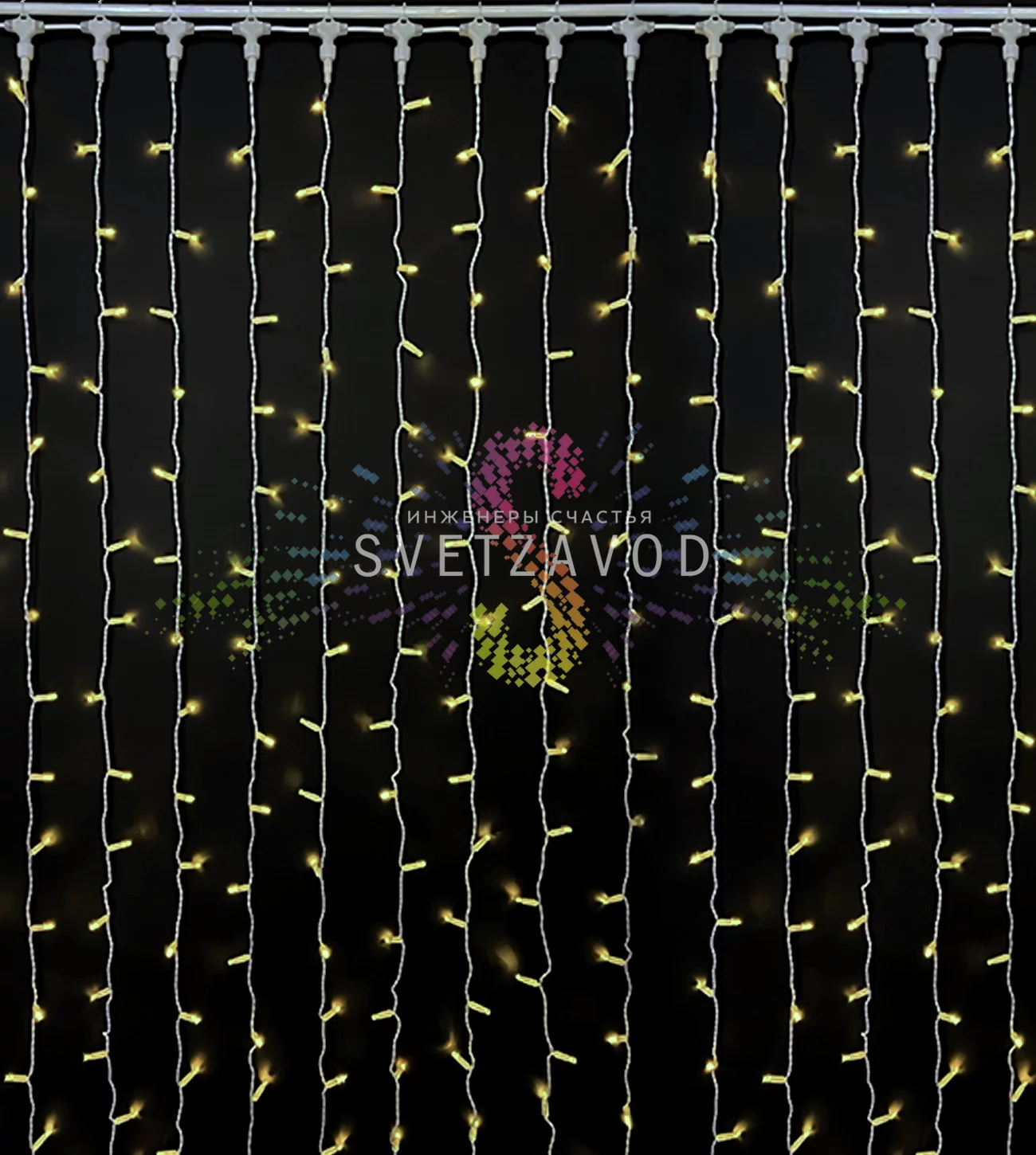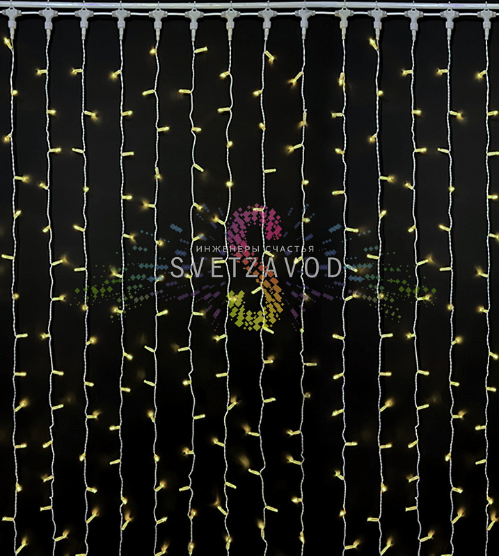 Прочная конструкция: Занавес выполнен в белом ПВХ-корпусе с фиксированным креплением. Все соединения герметичны, а светодиоды защищены колпачками, что обеспечивает стабильную работу при дожде и снеге.