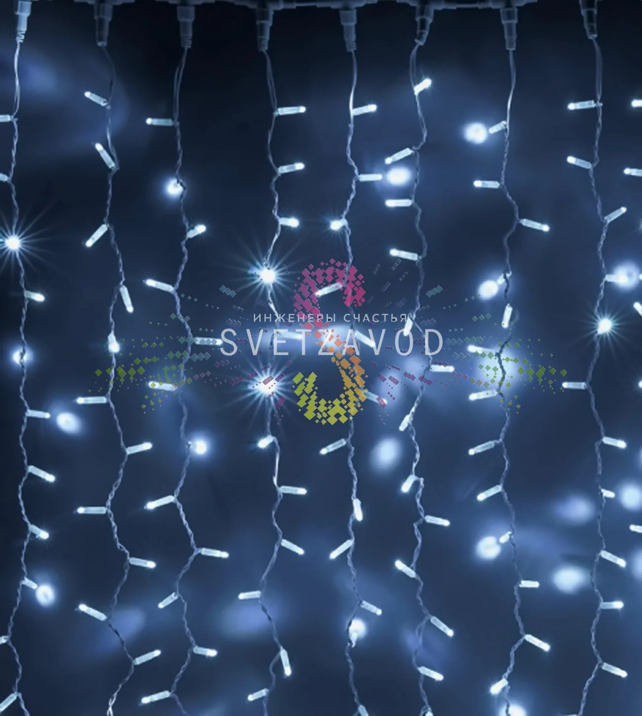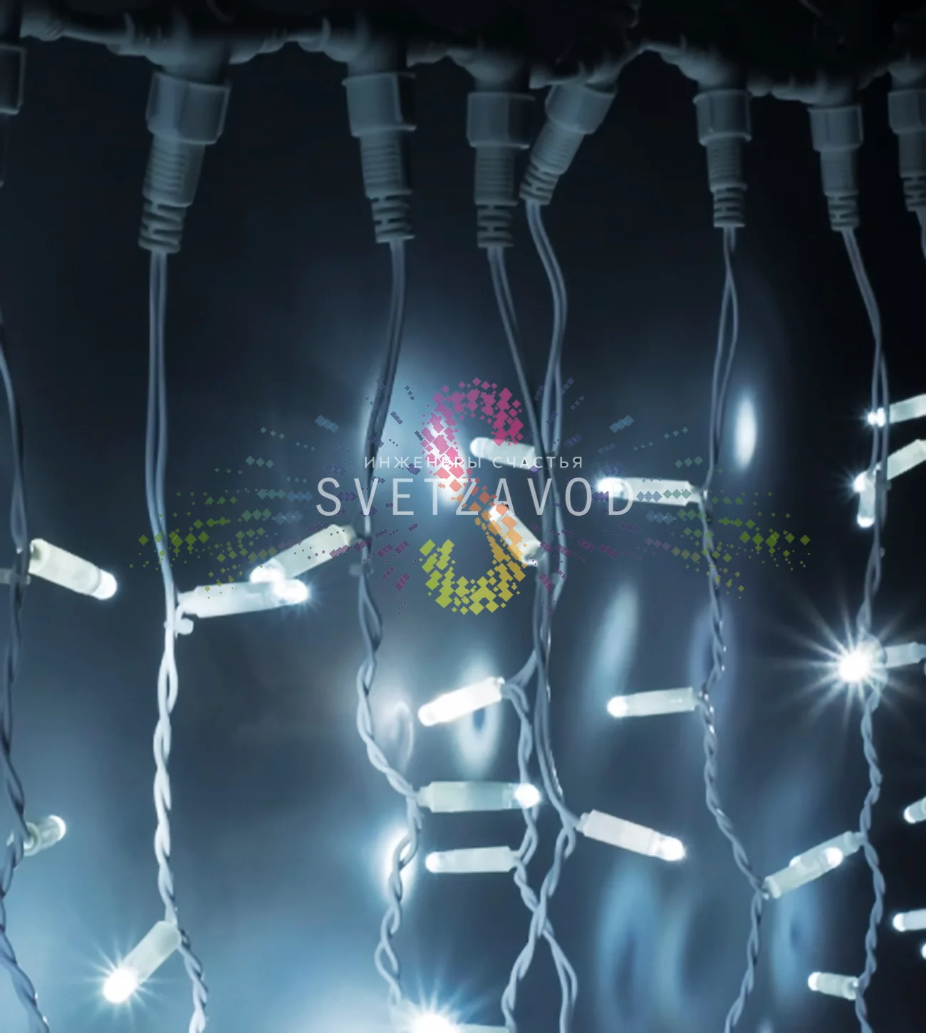 На каждой из 20 нитей расположено по 37 светодиодов, что в сумме дает 740 ярких точек холодного белого свечения. Расстояние между нитями — 10 см, что обеспечивает плотный световой занавес без «проплешин».