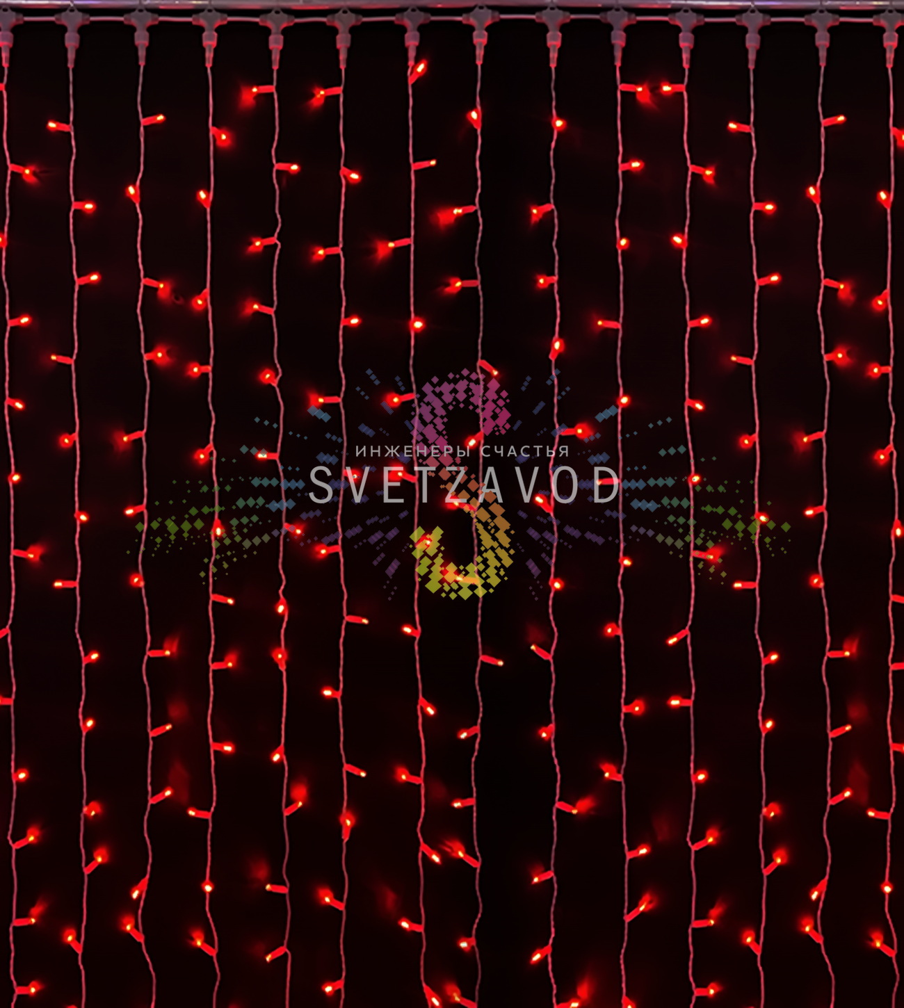 Конструкция включает 20 вертикальных нитей по 3 метра каждая, закрепленных на 2-метровом горизонтальном шлейфе. Красные светодиоды создают насыщенное цветовое решение.