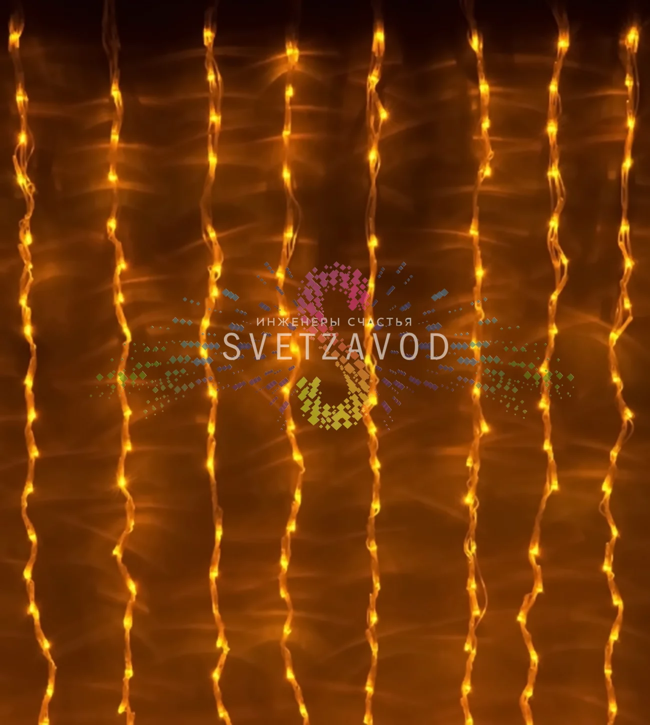Занавес собран на основе 21 вертикальной нити длиной 3,6 метра, закрепленных на горизонтальном шлейфе. Прозрачный провод из ПВХ делает конструкцию практически невидимой днем, позволяя светодиодам раскрыть всю яркость в темноте. Все необходимое для работы уже в коробке: контроллер с программами, блок питания и соединительные коннекторы.