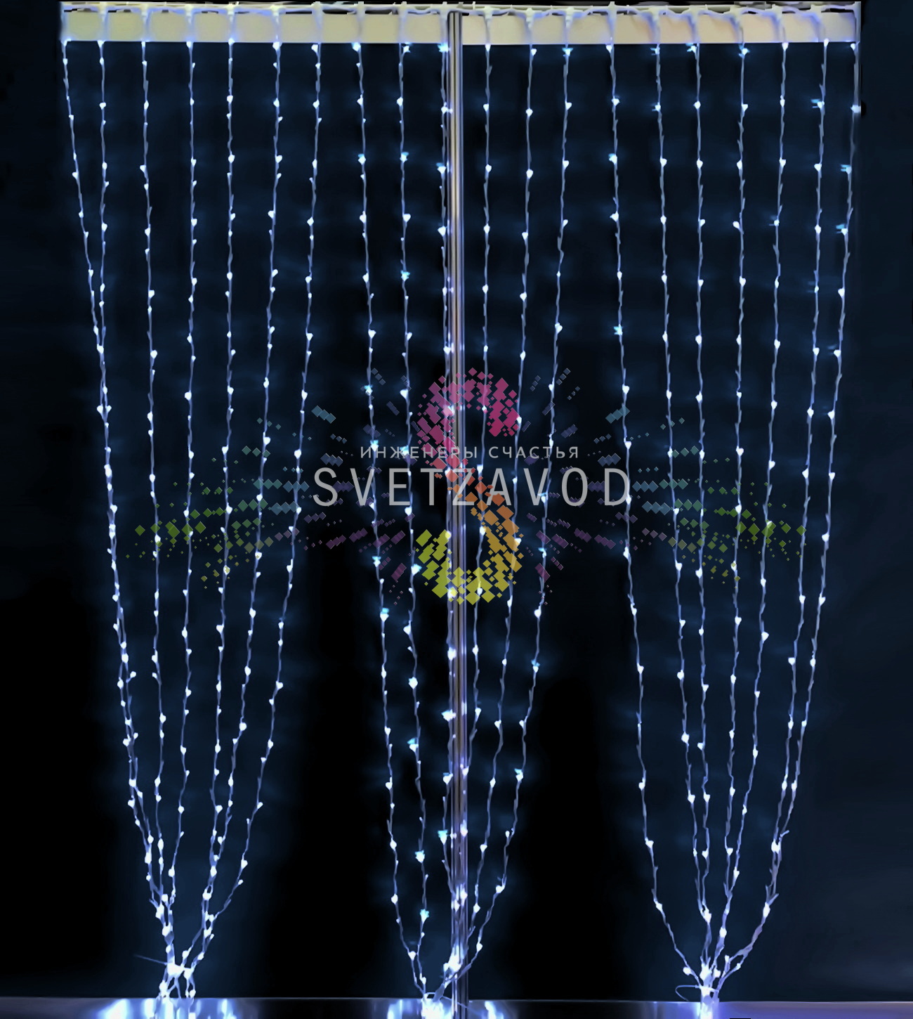 Световой занавес с эффектом водопада является идеальным и уникальным решением для создания яркой, праздничной атмосферы. Наслаждение, приносимое светодиодной гирляндой «Водопад», сопоставимо с созерцанием ночного звездного неба или течения воды. В гирлянде "Водопад", ряды светодиодов последовательно мерцают, создавая эффект "текущей воды". Украсив свое заведение с помощью светового водопада, Вы будете уверены, что Вас запомнят и к Вам обязательно придут снова! Световой занавес состоит из горизонтального шлейфа длиной 2,0 метра, на который уже и устанавливаются 13 вертикальных нитей-гирлянд, длиной 3 метра каждая, с расположенными на них светодиодами (585 штук в сумме на всю гирлянду). Цвет проводов, в зависимости от модификации может быть как черного, так и прозрачного цвета. Данные водопады соединяются между собой до 2 шт. Контроллер для гирлянды в комплекте.