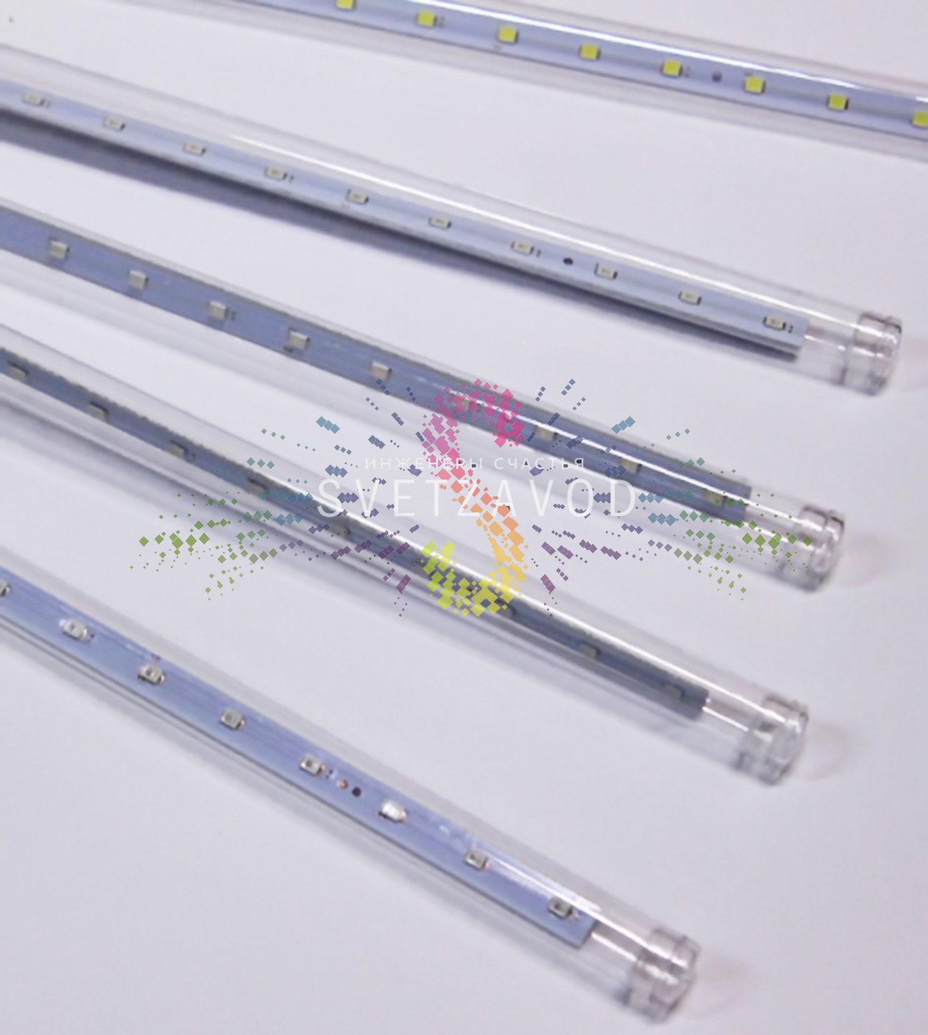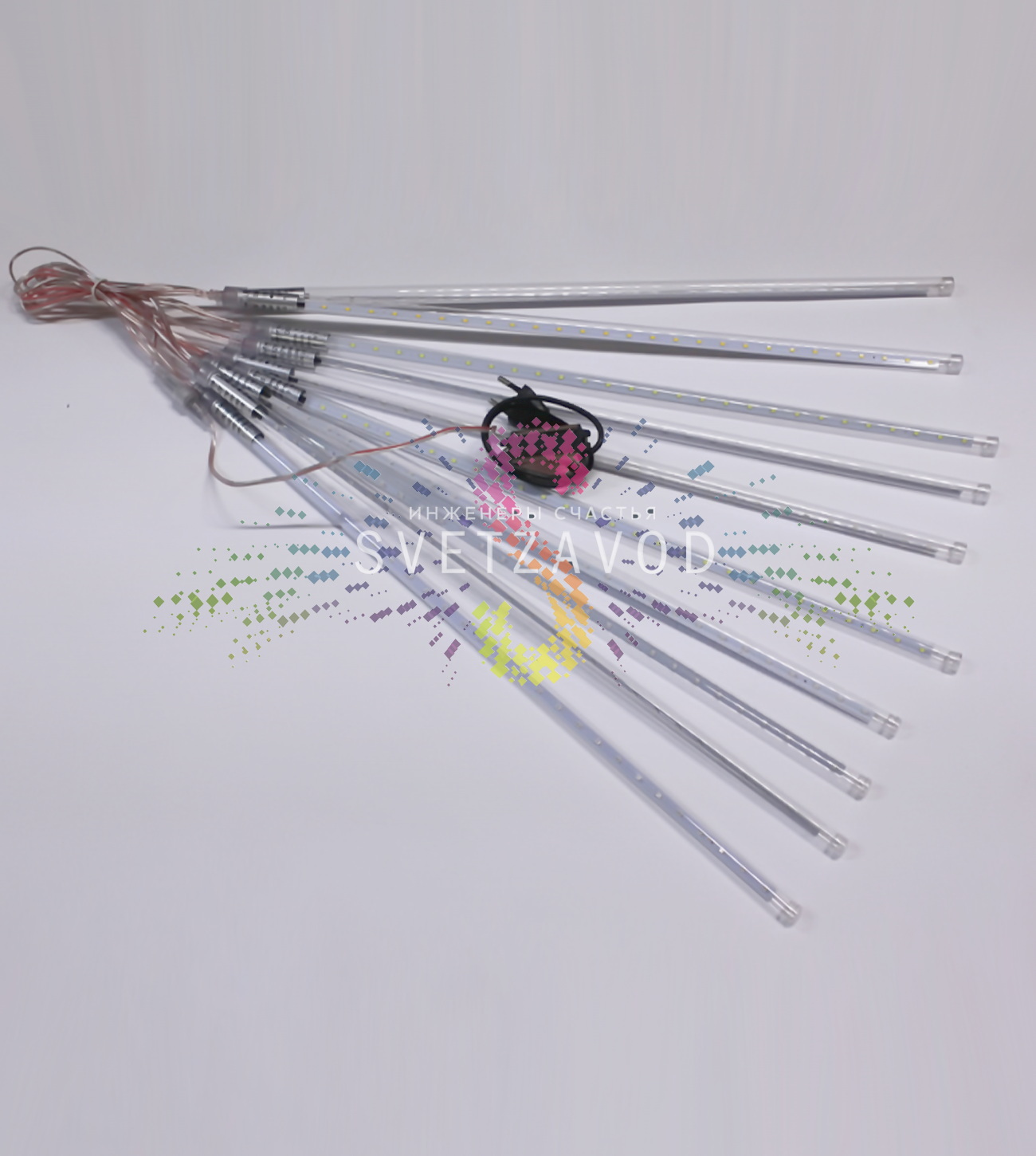 Комплект тающих сосулек состоит из 10 независимых световых элементов длиной 50 см, расположенных на основном кабеле 4.5 метра. Расстояние между сосульками - 45 см. Низковольтное питание 12В обеспечивает полную электробезопасность.