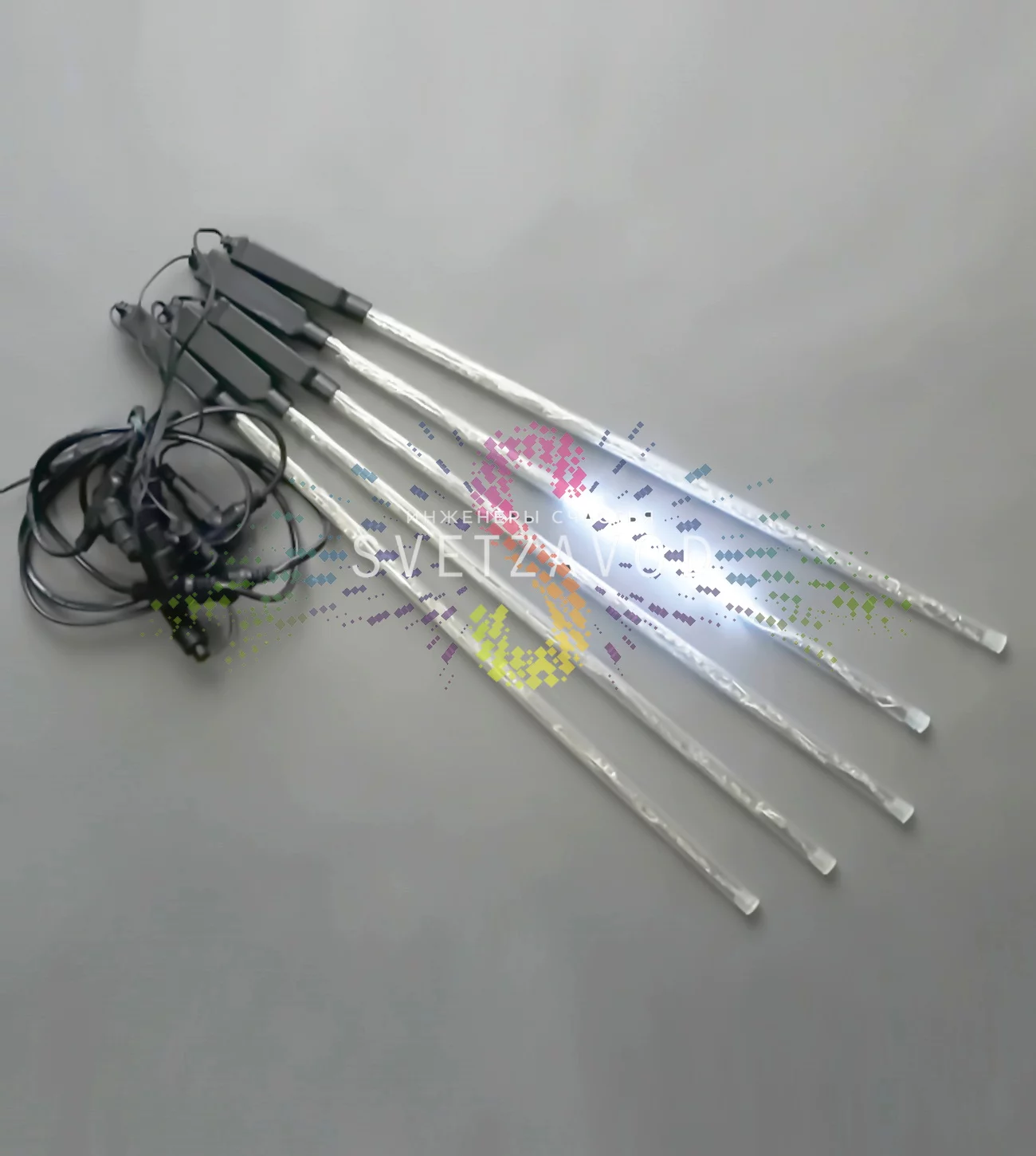 Гирлянда состоит из прочного основного кабеля длиной 5 метров, к которому через каждый метр закреплены 5 прозрачных пластиковых трубок («сосулек»). Каждая трубка заполнена яркими светодиодами, управляемыми микроконтроллером для создания эффекта **гирлянда метеоритный дождь**. Конструкция продумана для удобства монтажа и долговечности.