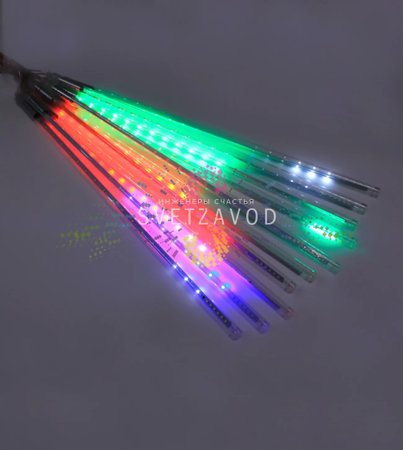 Этот комплект из 10 светодиодных нитей длиной по 50 см создает иллюзию стекающих световых капель с ярким строб-эффектом внизу. Мультицветная RGBY-палитра обеспечивает плавные переливы, а низковольтное питание 7В делает украшение безопасным для улицы и дома. Если вы ищете, где тающие сосульки купить для профессионального или домашнего декора, этот набор — готовое решение с полной комплектацией.