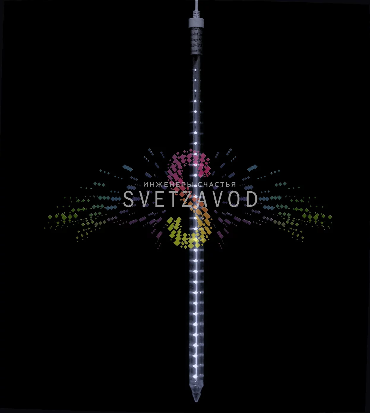 Каждая сосулька «Метеор» — это герметичная пластиковая трубка длиной 60 см, внутри которой расположена плата с 72 яркими светодиодами. Эффект тающей капли создается встроенным программируемым чипом. Низковольтное питание 24В делает эксплуатацию абсолютно безопасной для деревьев, фасадов и домашнего использования.