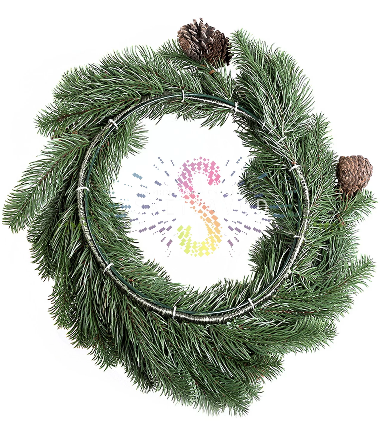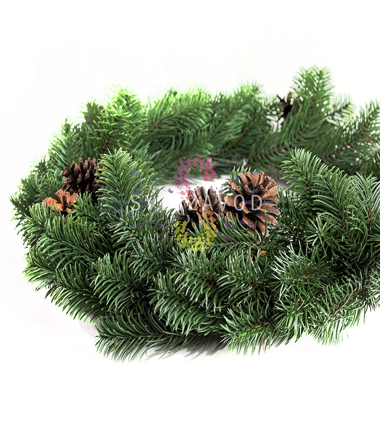 Технология: Венок изготовлен по технологии литья под давлением. Каждая из 85 веток имеет детально проработанную, мягкую и неколючую хвою. 10 декоративных шишек дополняют натуралистичный вид.