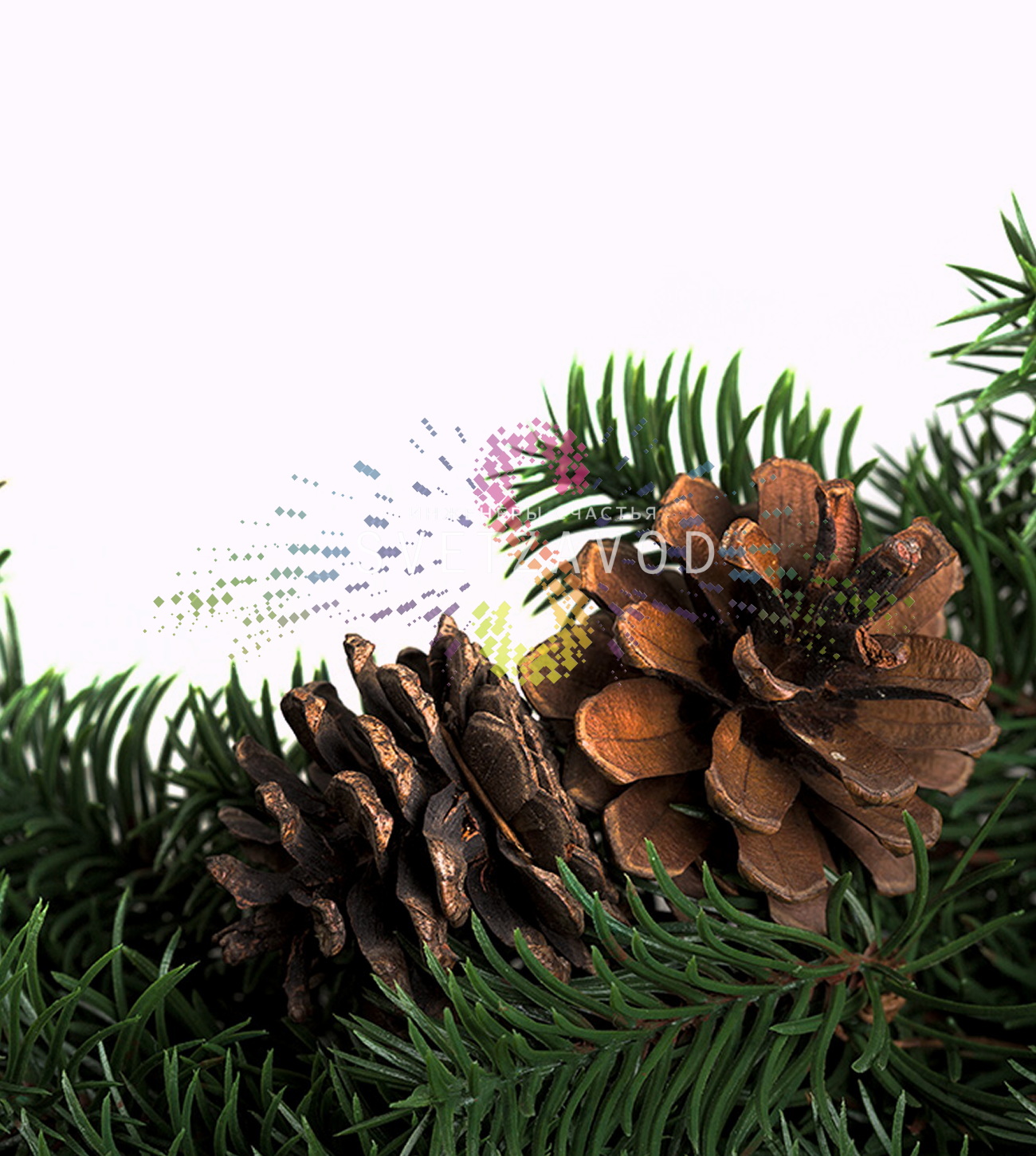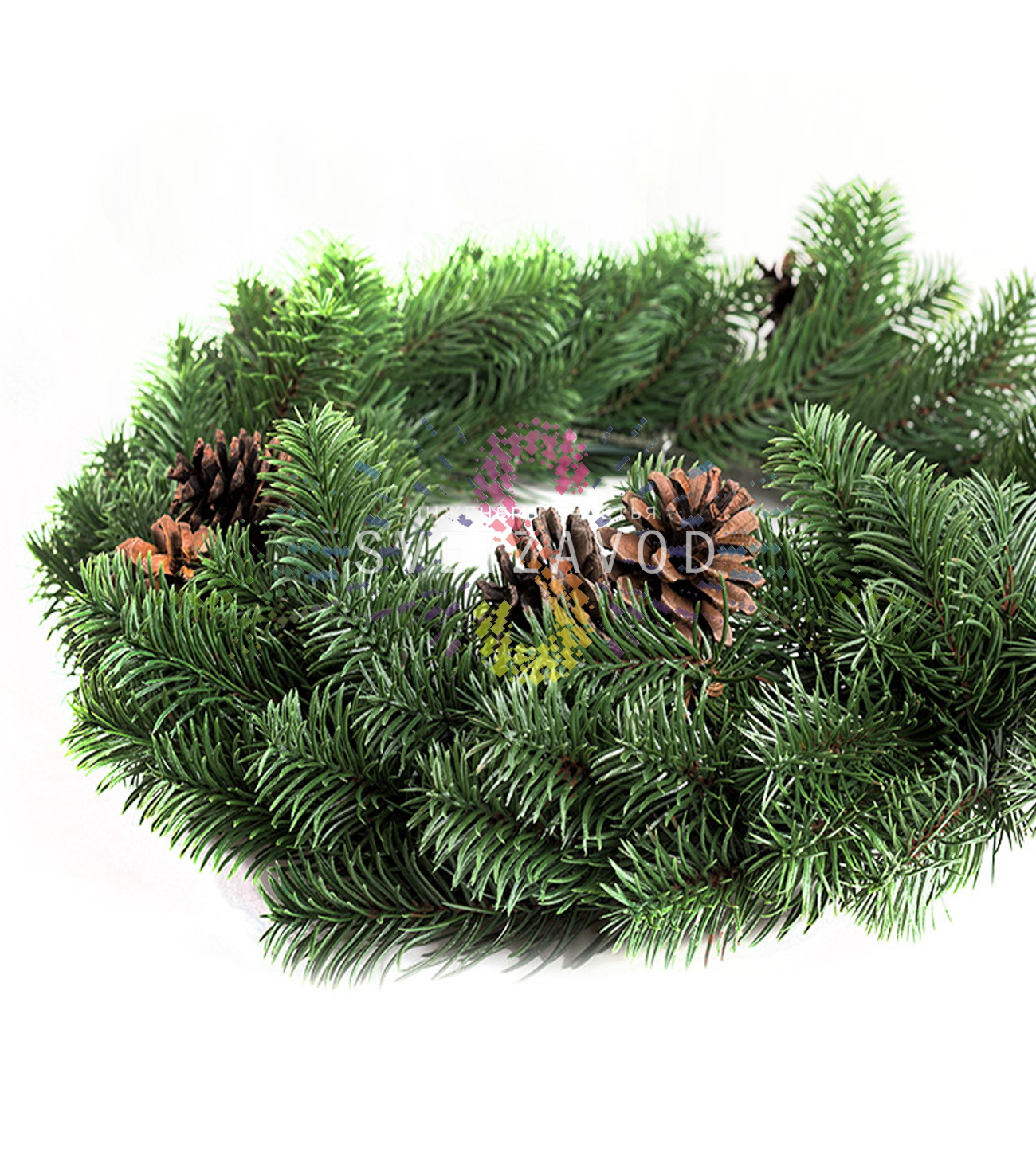 Венок состоит из 85 литых веток с мягкими, неколючими иголками темно-зеленого цвета, украшен 10 декоративными шишками коричневого оттенка.