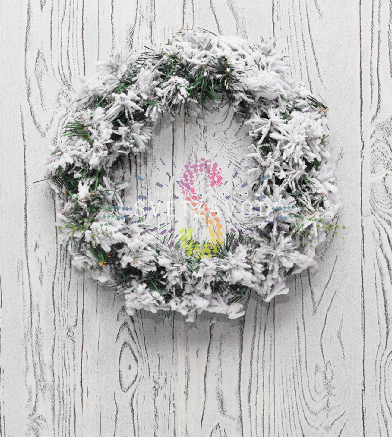 Прочная основа венка обеспечивает устойчивость формы, а равномерное распределение веток создает объемный, пышный силуэт. Эффект естественного снега выглядит максимально реалистично и не осыпается при эксплуатации.