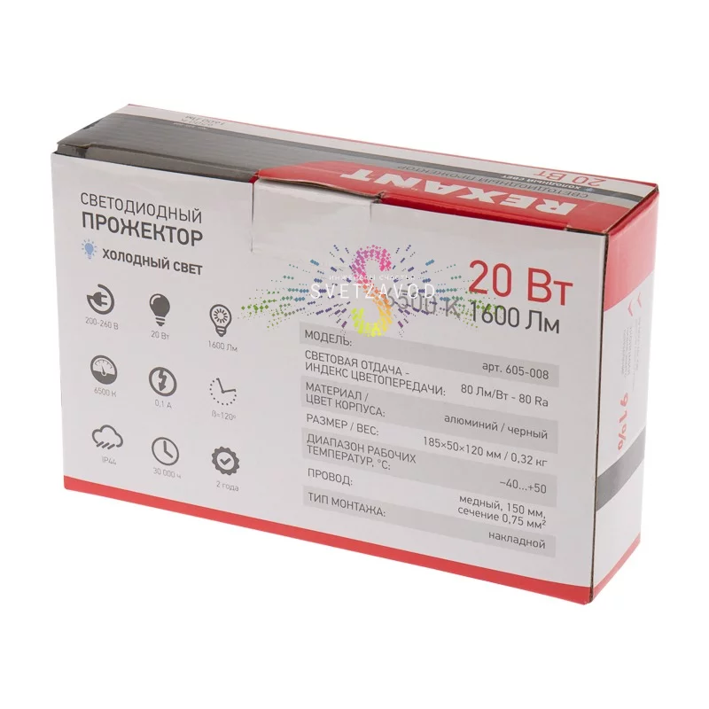 Энергопотребление 20Вт позволяет экономить до 80% электроэнергии по сравнению с традиционными прожекторами аналогичной яркости.