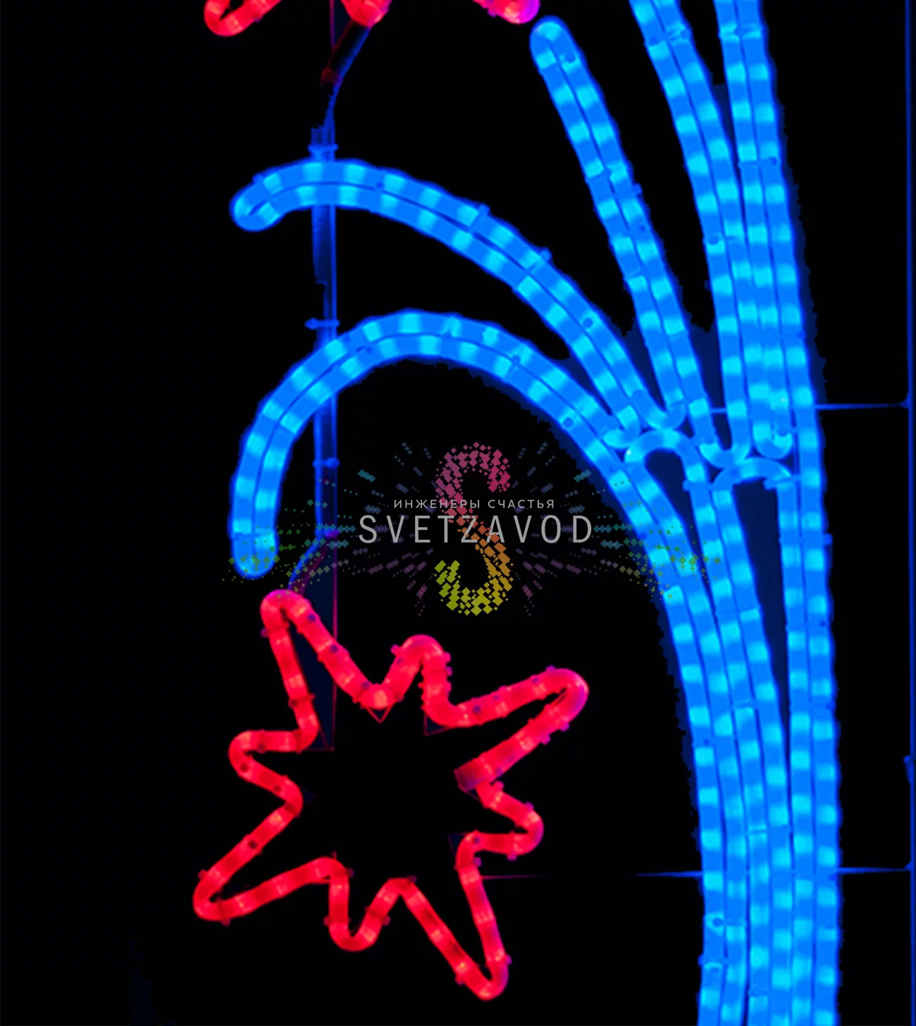 Консоль на столб освещения размером 150х50 см идеально подходит для масштабного оформления городских пространств. Сочетание красных звезд и синего шлейфа создает динамичный визуальный акцент, работающий в режиме постоянного свечения.
