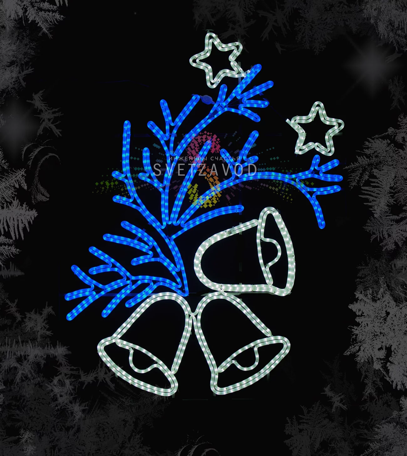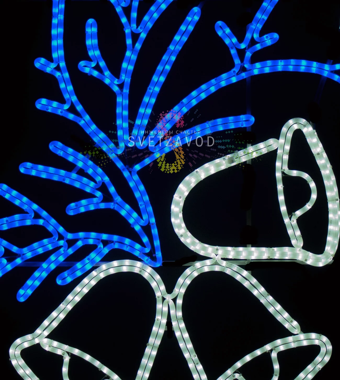 Элегантная композиция из белых колокольчиков на синей ветке видна издалека, равномерно подсвечивая пространство и создавая волшебное новогоднее настроение.