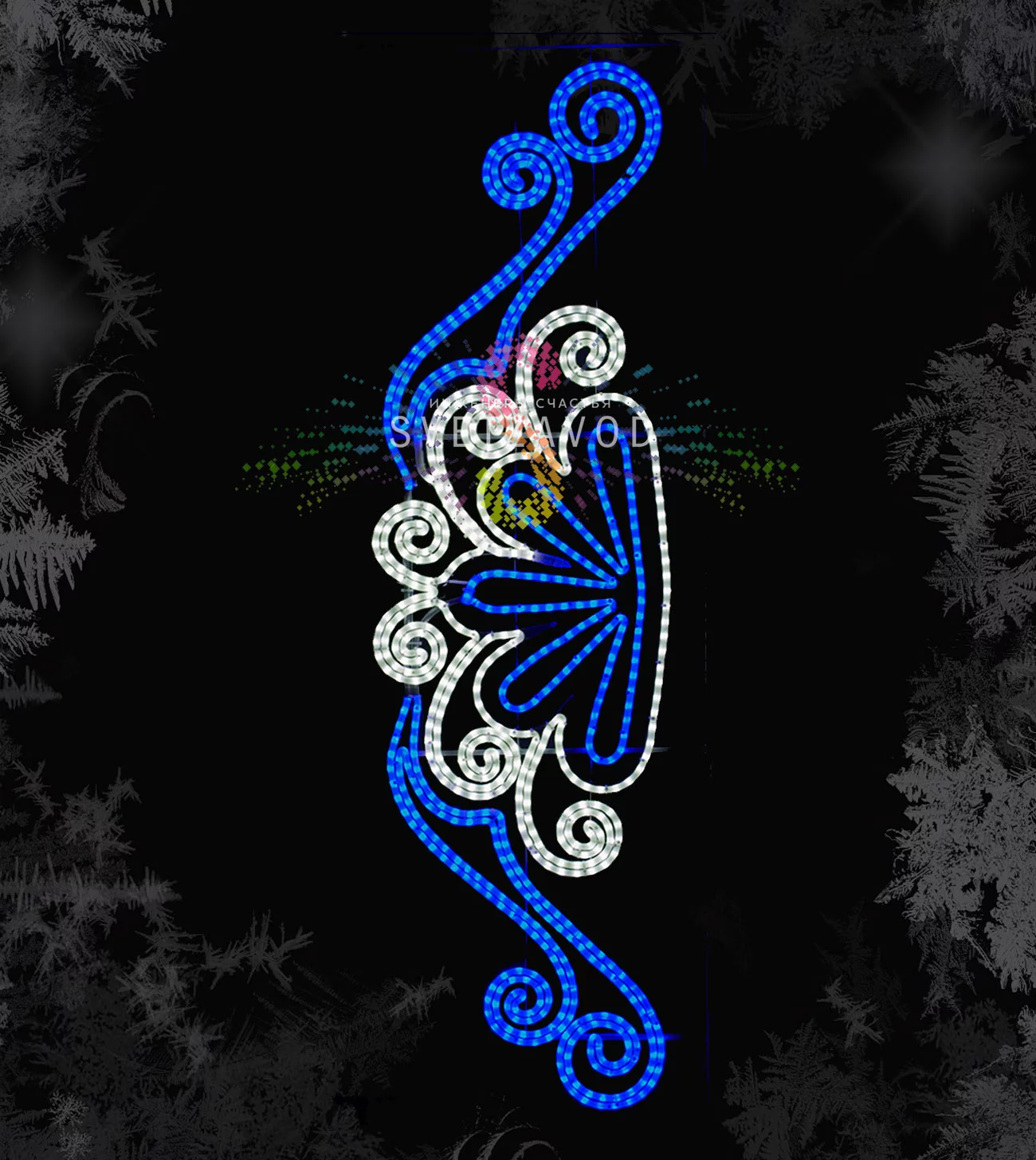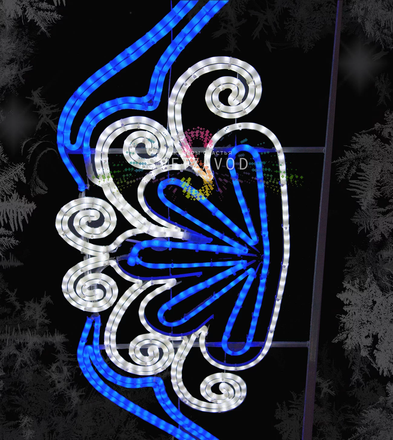 Устройство: Основой консоли служит прочный каркас из оцинкованной стали с полимерным покрытием, обеспечивающим защиту от коррозии. На каркас закреплен светодиодный дюралайт в сине-белом цветовом исполнении. Герметичные соединения и влагозащищенные светодиоды гарантируют стабильную работу в любую погоду.