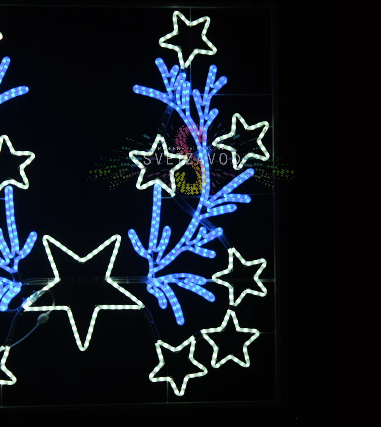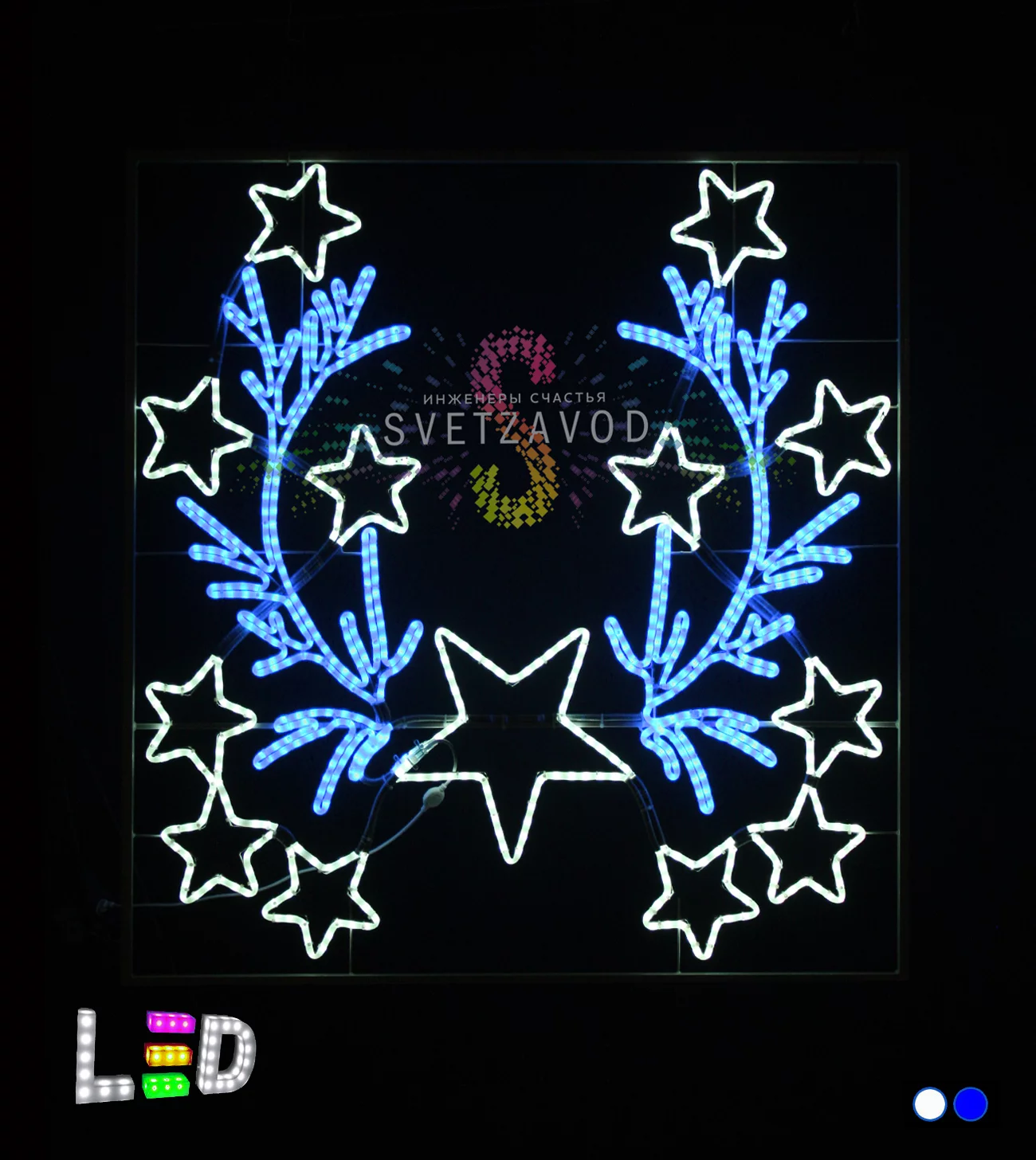 Светодиодная консоль "Синие звезды" — это готовое решение для праздничного и постоянного оформления. Она создает яркую световую точку, которая заметна издалека. Сочетание глубокого синего фона и ярких белых лучей делает дизайн универсальным: от новогодних праздников до патриотических событий. Оптимальный размер 150×145 см позволяет эффективно заказать украшение столбов для муниципальных программ, ТЦ или частных владений. Качественная сборка и защита IP65 гарантируют долгую службу в любую погоду.