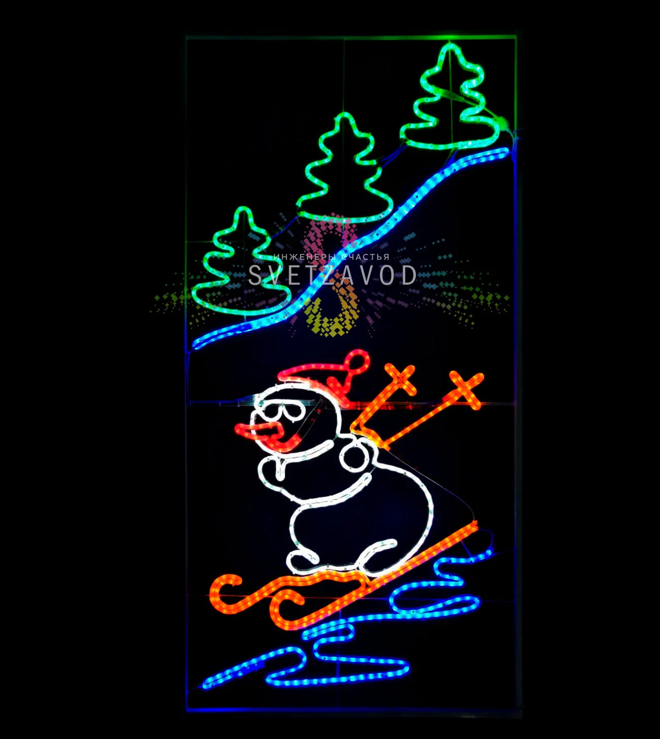 Консоль выполнена в виде забавного снеговика на лыжах, что делает ее особенно привлекательной для создания новогоднего настроения в парках, на улицах и площадях.