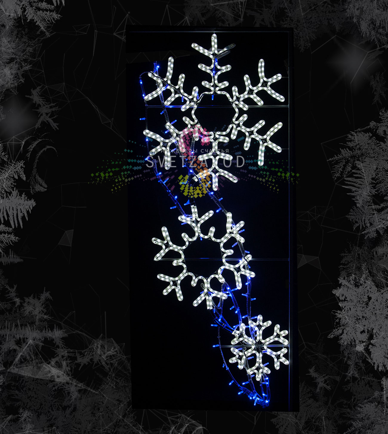 На невероятно глубоком синем фоне, практически сливающимся с темным небом, сверкают серебром три филигранные снежинки. Конструкция выполнена из гибкого LED-дюралайта на металлическом основании. Благодаря такому сочетанию материалов ваше панно будет исправно работать и при повышенной влажности, и при низких температурах. Ему совершенно не страшны порывы ветра и пыль.