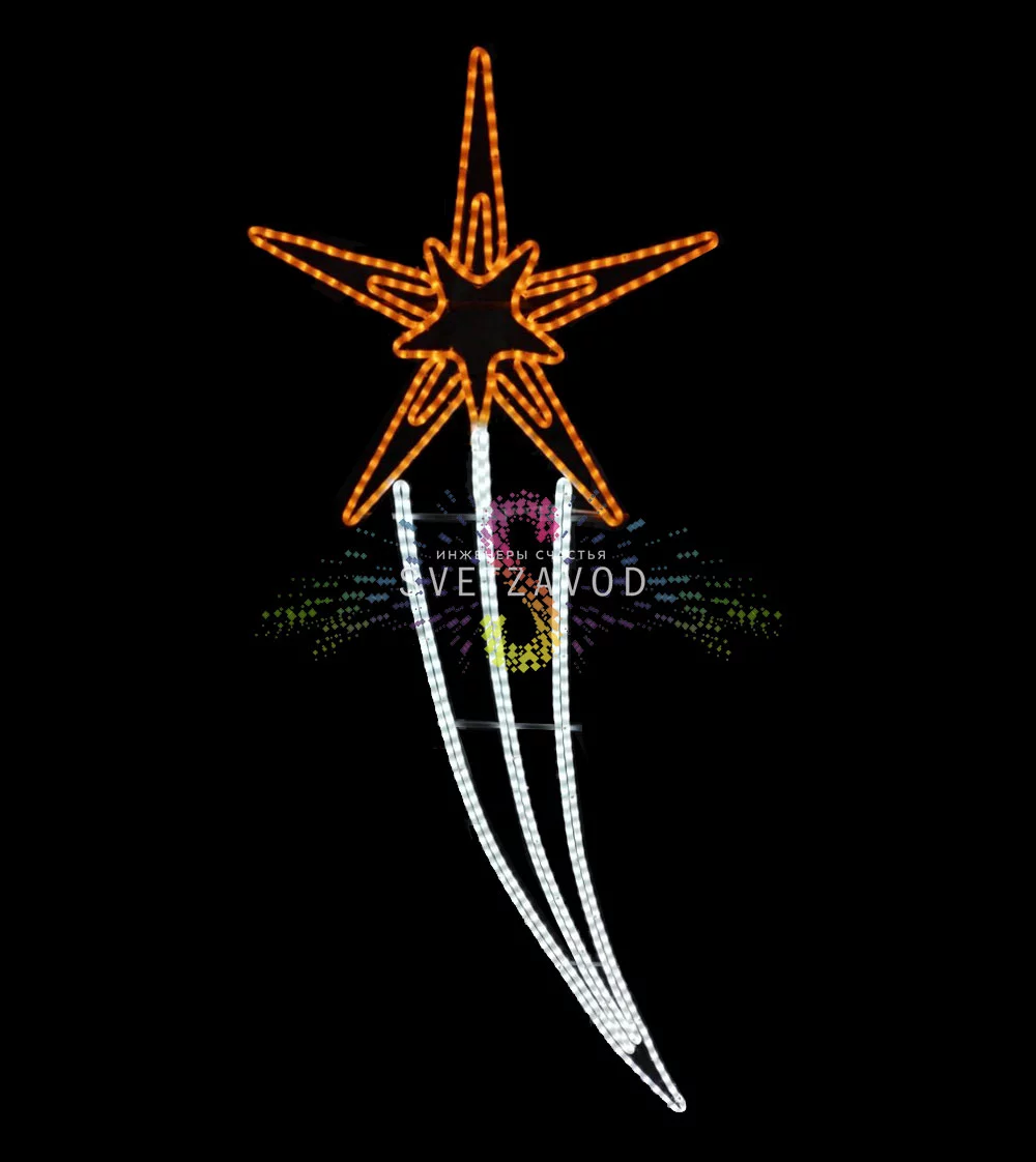 Консоль выполнена в виде стилизованной звезды с тонкими лучами и предназначена для крепления на уличные столбы освещения. Комбинация желтого и белого свечения делает ее универсальной для любого времени года. Заказать украшение столбов такой световой фигурой — значит получить яркий акцент, который заметен издалека.