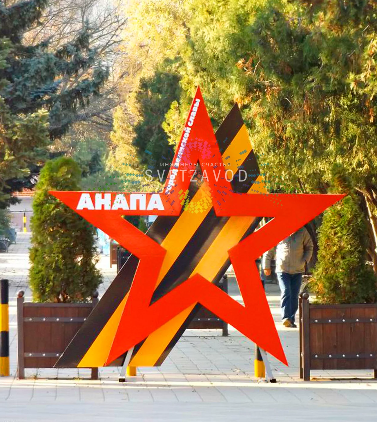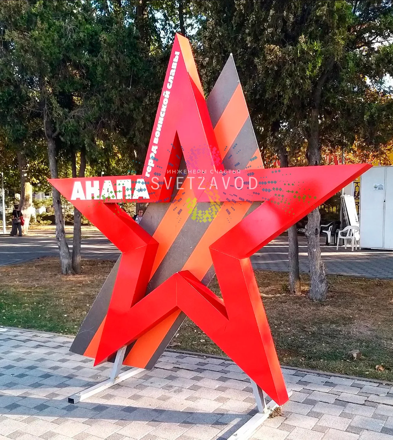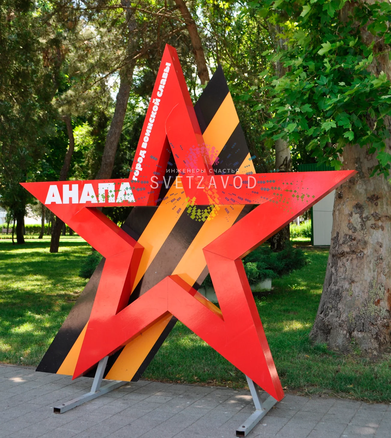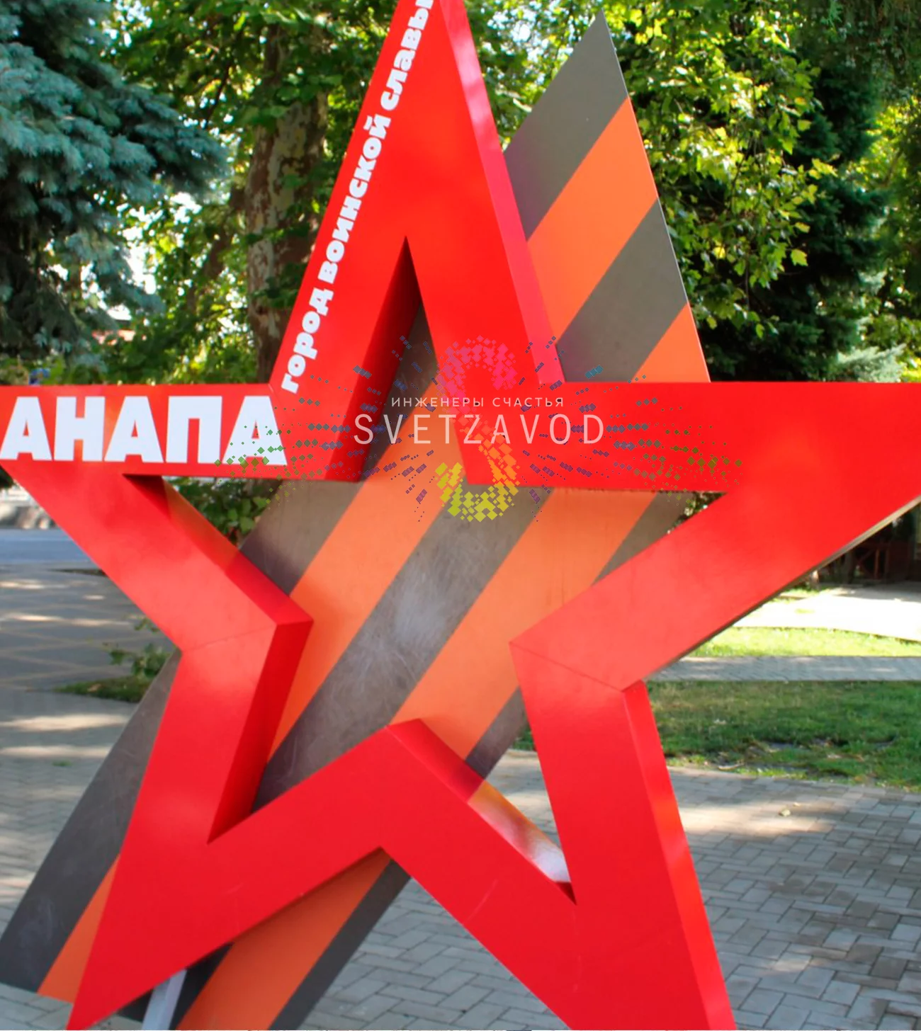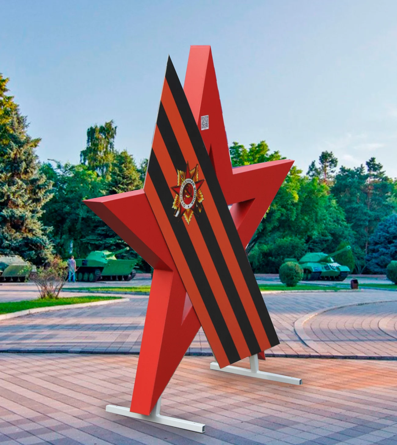 Символ памяти и торжества: Объемная декоративная конструкция "Звезда с лентой" — это готовое и долговечное решение для оформления на 9 мая. Она создает торжественную атмосферу и привлекает внимание ярким дизайном с георгиевской лентой и надписями "ДЕНЬ ПОБЕДЫ", "АЛЛЕЯ ПОБЕДЫ". Это идеальный элемент для украшения площадей, парков, мемориальных зон и административных зданий, позволяющий создать единое праздничное оформление города.
