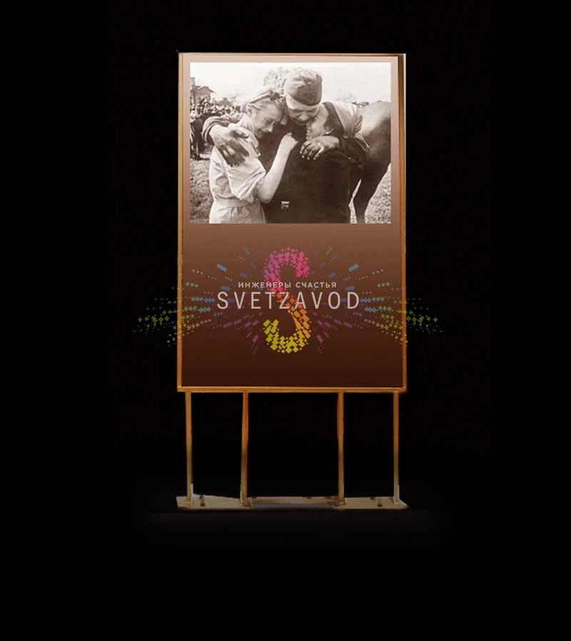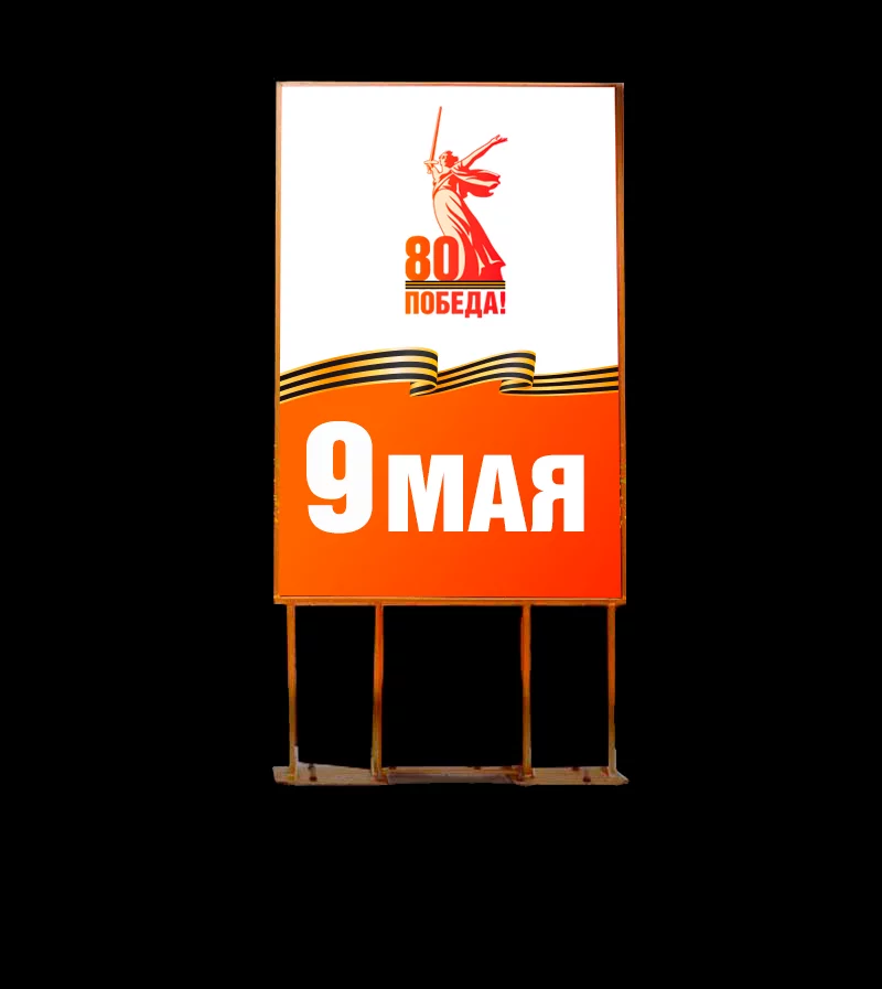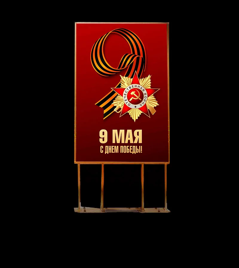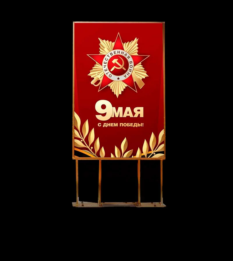 Основа: Прочный стальной каркас с защитным покрытием, обеспечивающий жесткость и устойчивость конструкции даже при сильном ветре. Двухсторонние композитные панели с яркой полноцветной печатью символики Дня Победы гарантируют отличную видимость с любого направления.