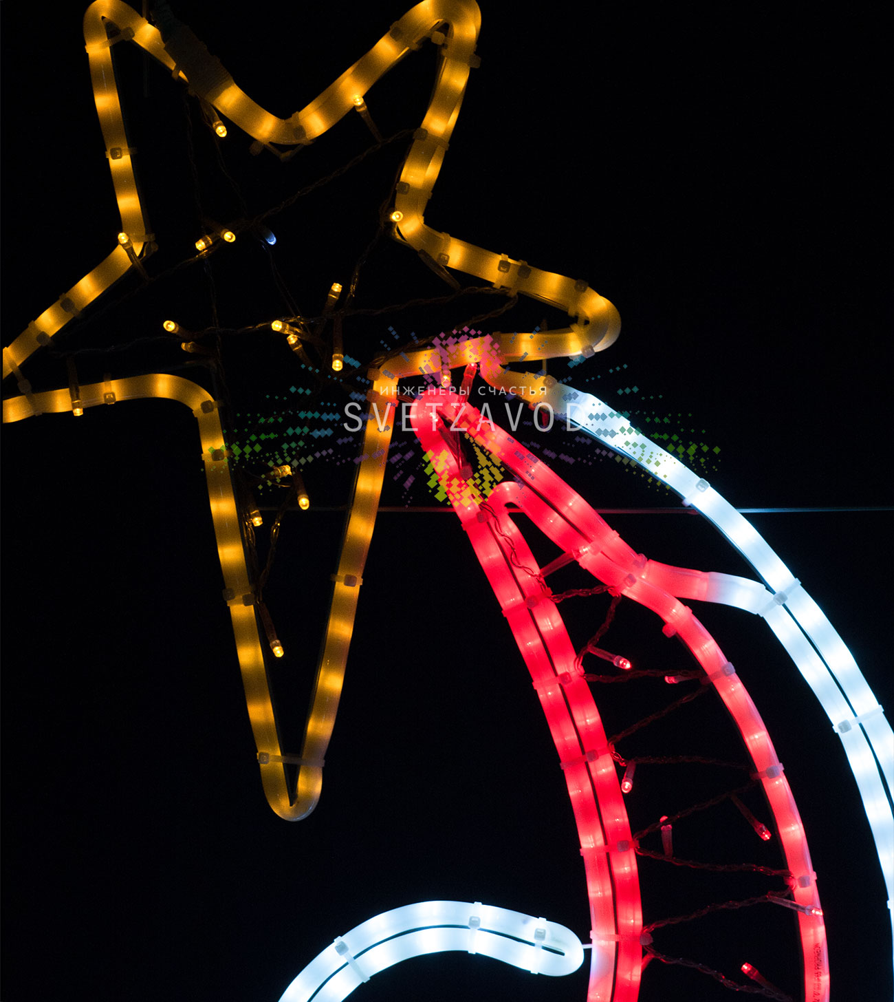 Современное праздничное освещение: Светодиодная консоль "Фейерверк" разработана специально для торжественного украшения городской среды к 9 мая. Её дизайн в форме летящей звезды со шлейфом, выполненный в цветах российского триколора, создает мощный визуальный акцент, подчеркивая значимость Дня Победы.