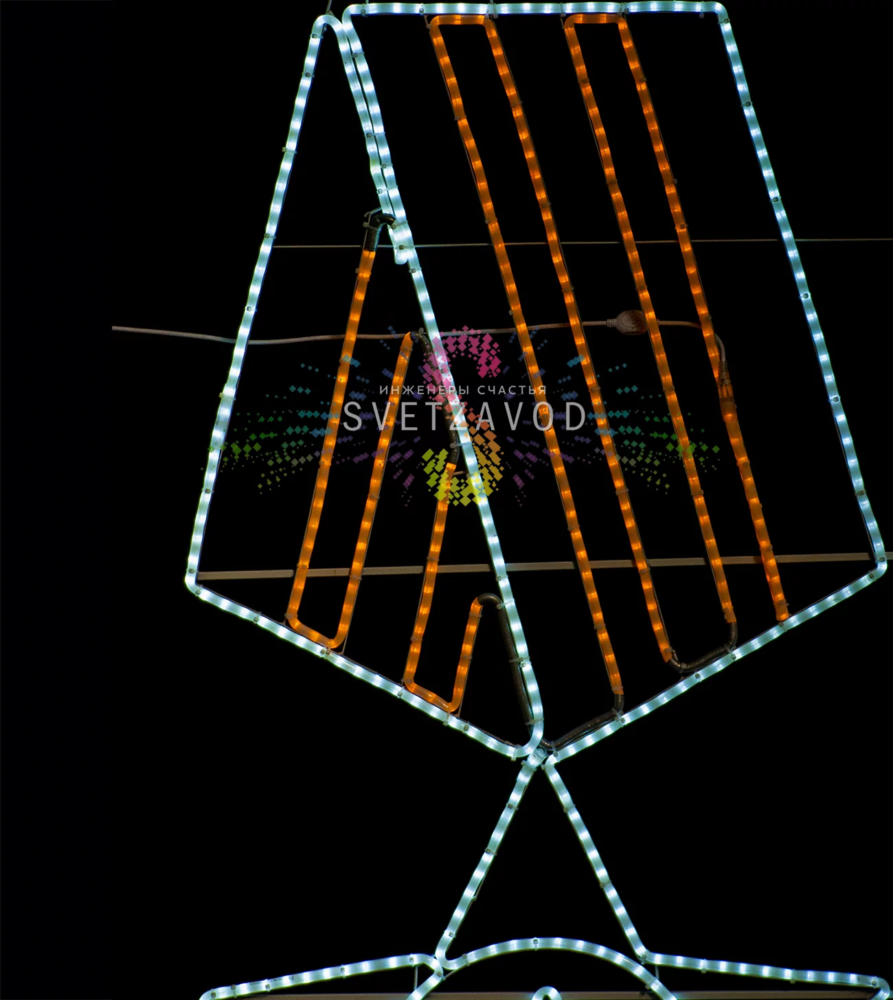 Изделие выполнено в размере 150х80 см и предназначено для установки на уличные опоры освещения, превращая их в элементы праздничного декора.