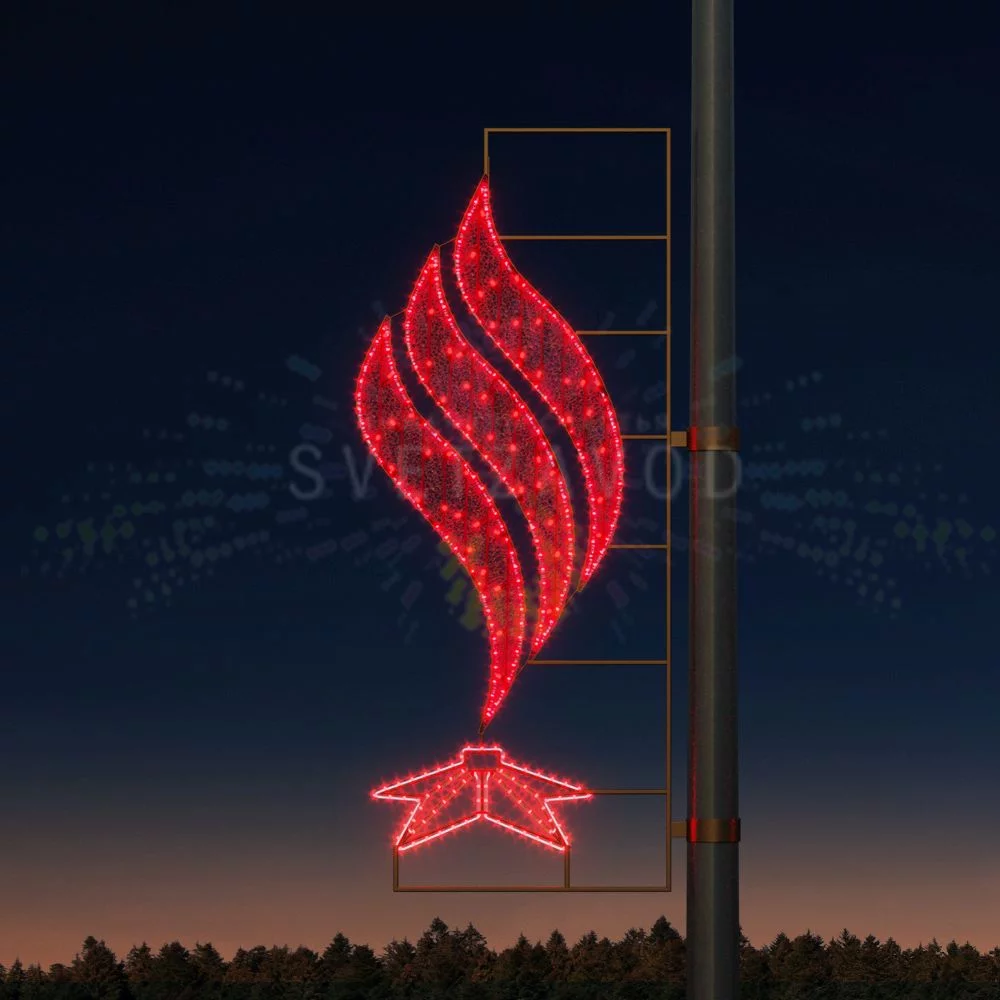 Решение: Готовая светодиодная консоль «Вечный огонь» в форме пятиконечной звезды. Это символ памяти, который легко купить и установить на любые столбы. Она обеспечивает яркое, энергоэффективное свечение и выдерживает российские погодные условия, предлагая оптимальное соотношение цены и качества для праздничного оформления городов.