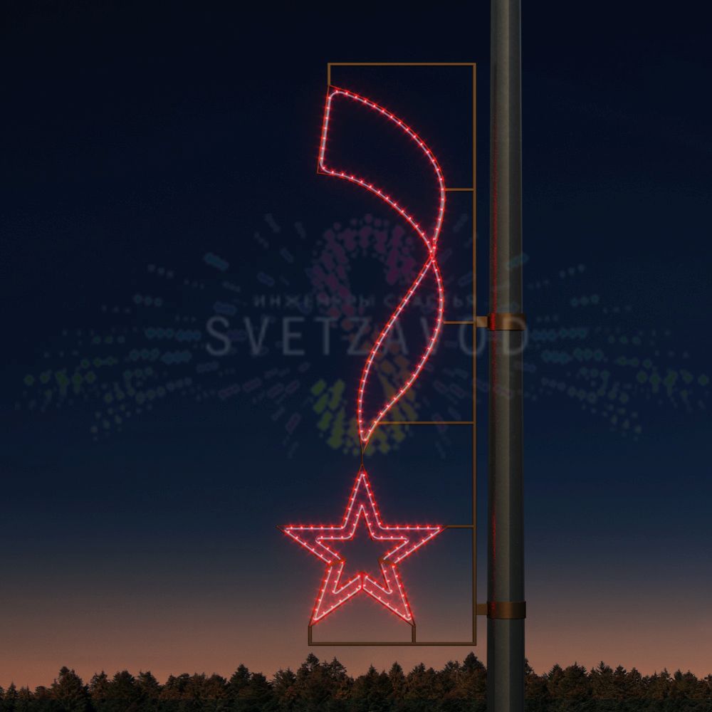 Консоль изготовлена в виде классической пятиконечной звезды с элементами георгиевской ленты, что делает её универсальным решением для праздничного украшения столбов освещения и других вертикальных опор.