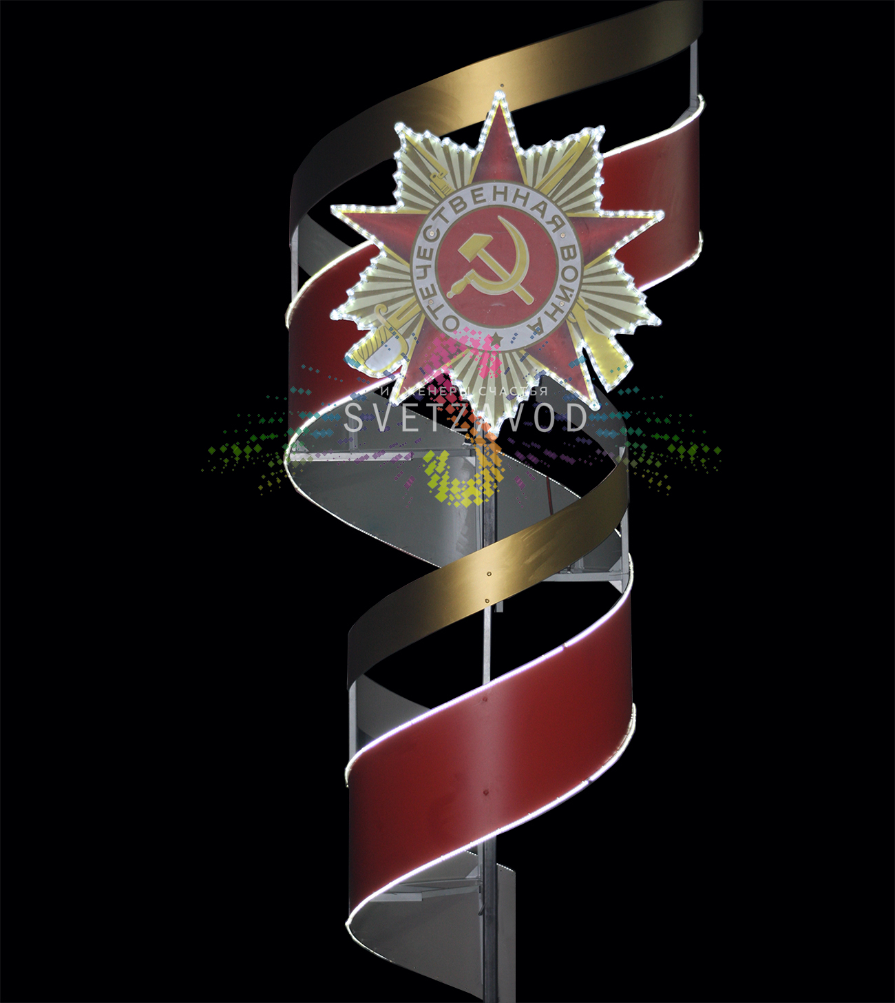 Современное праздничное решение: Светодиодная консоль "Лента победы" 350х140 см - это специализированное украшение для празднования Дня Победы 9 мая. Объемная 3D конструкция с точным воспроизведением ордена Отечественной войны создает торжественную атмосферу памяти и славы. Круговая контурная подсветка подчеркивает все элементы композиции, выполненной в традиционных цветах победы - красном, белом и золотистом.
