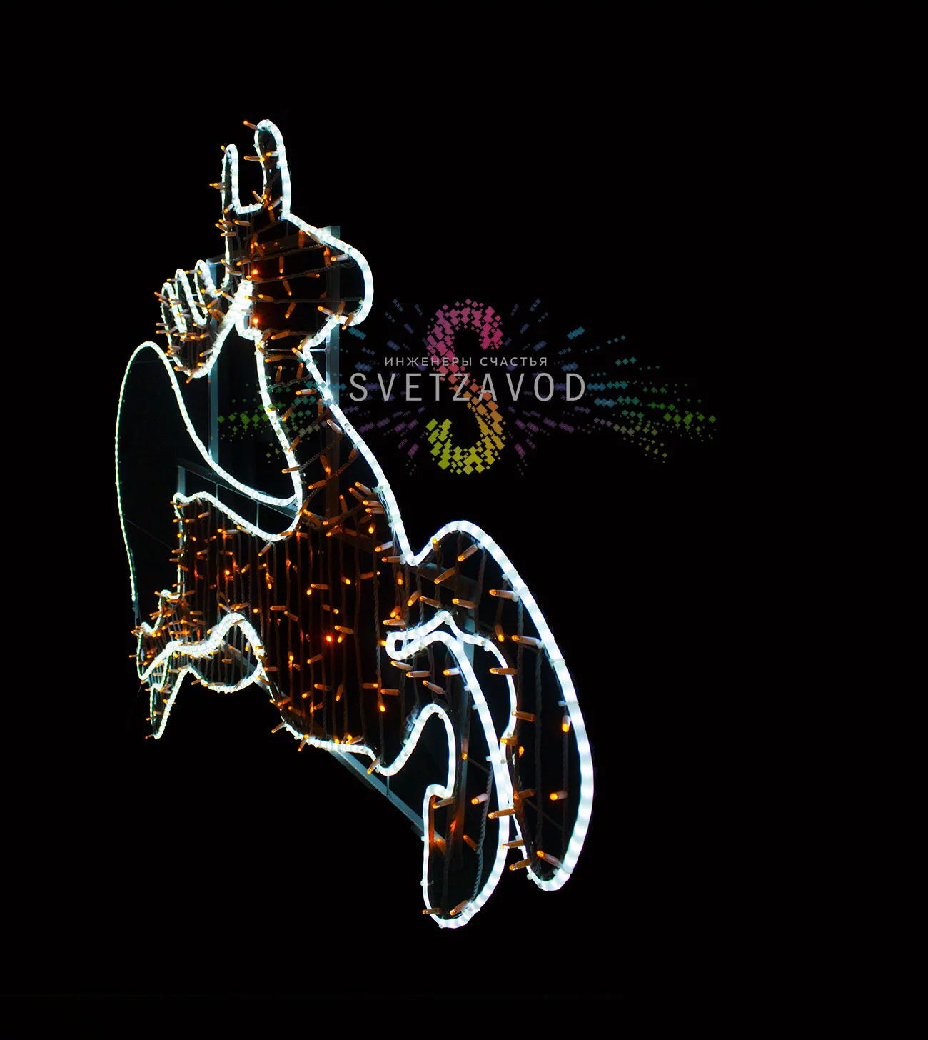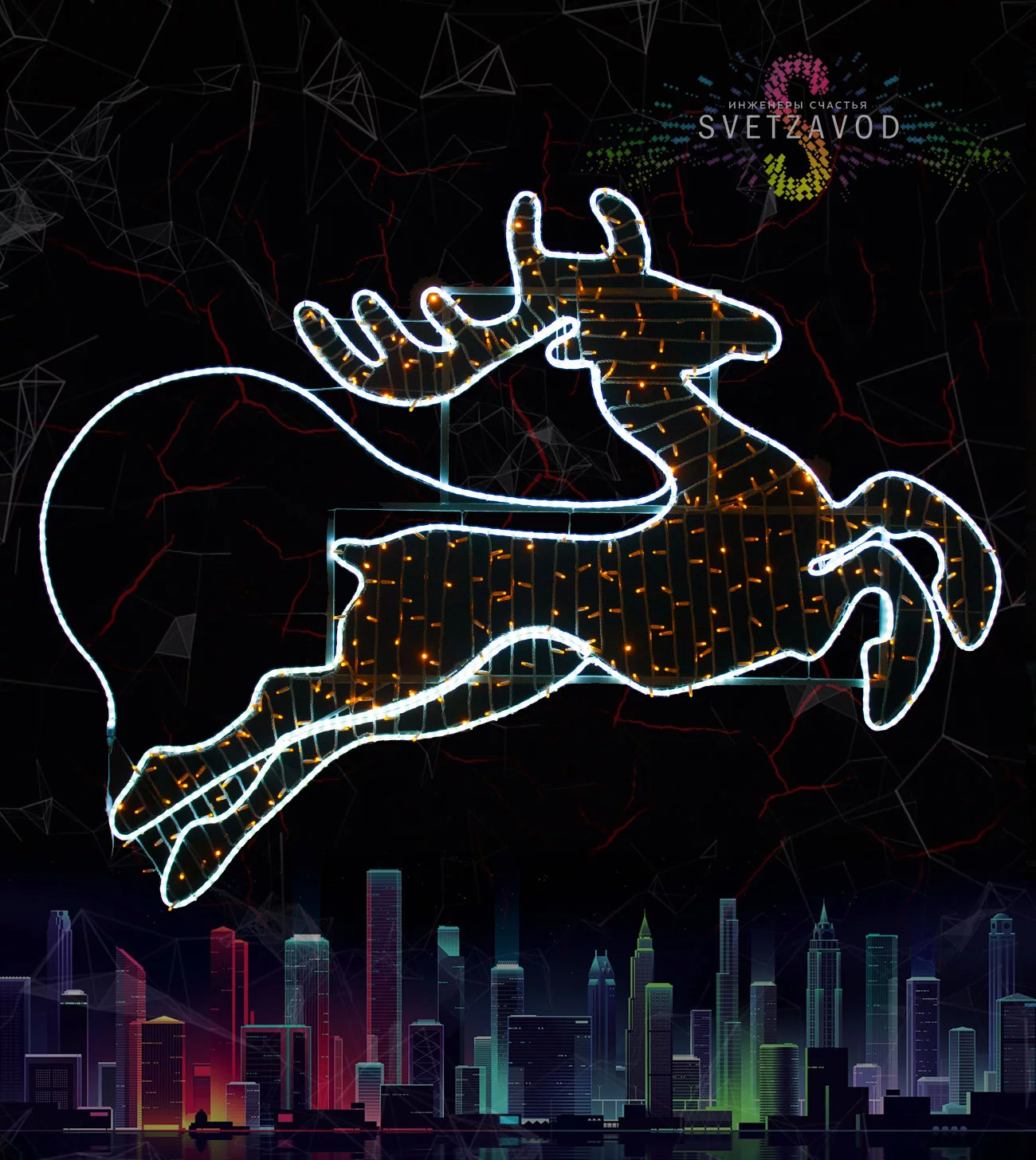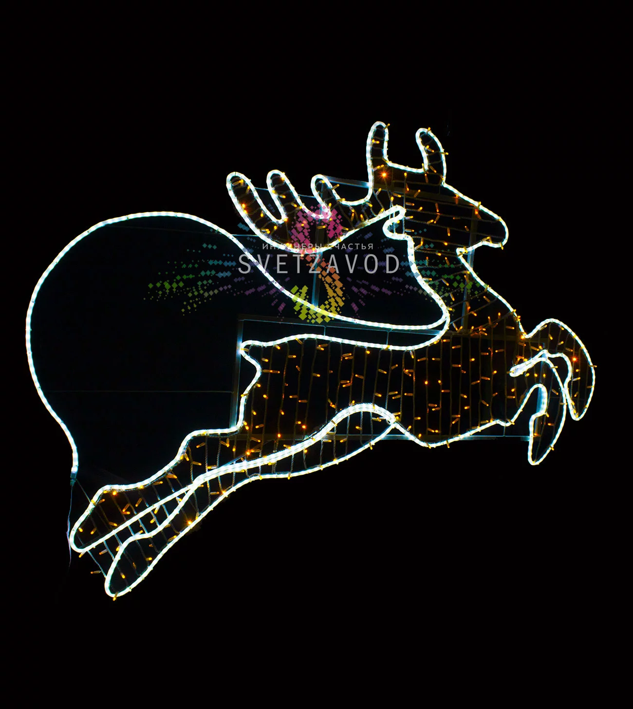 Световое панно «Летающий олень» — это готовый к использованию декор из дюралайта. Его размеры 230х180 см обеспечивают отличную видимость, создавая яркий праздничный образ для фасада здания, парка или торгового центра. Это выгодное предложение, чтобы купить новогодние мотивы с доставкой и простым монтажом.