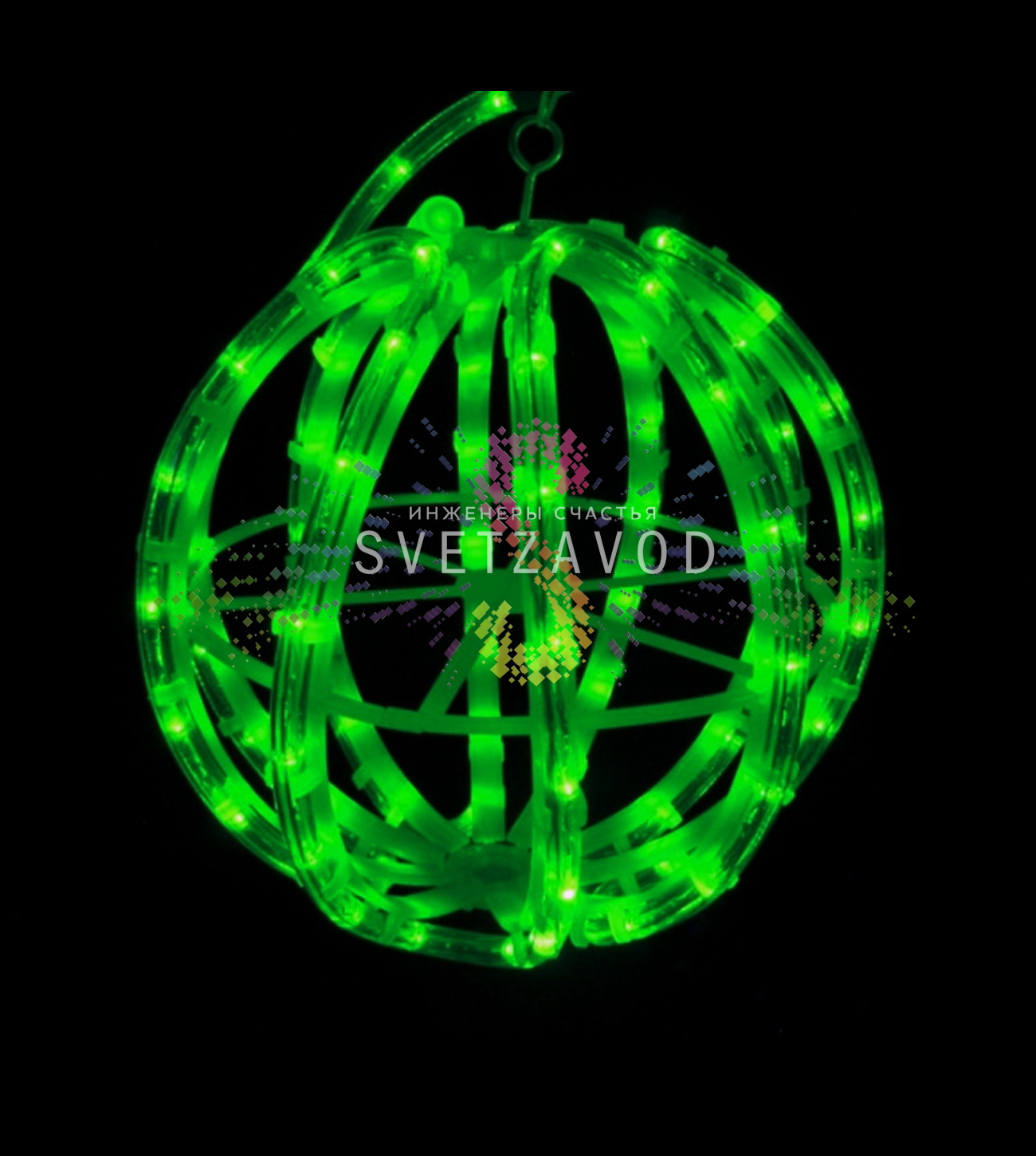 Объемная световая фигура представляет собой прочный пластиковый каркас в форме шара диаметром 30 см, на котором установлен светодиодный шнур дюралайт зеленого цвета.