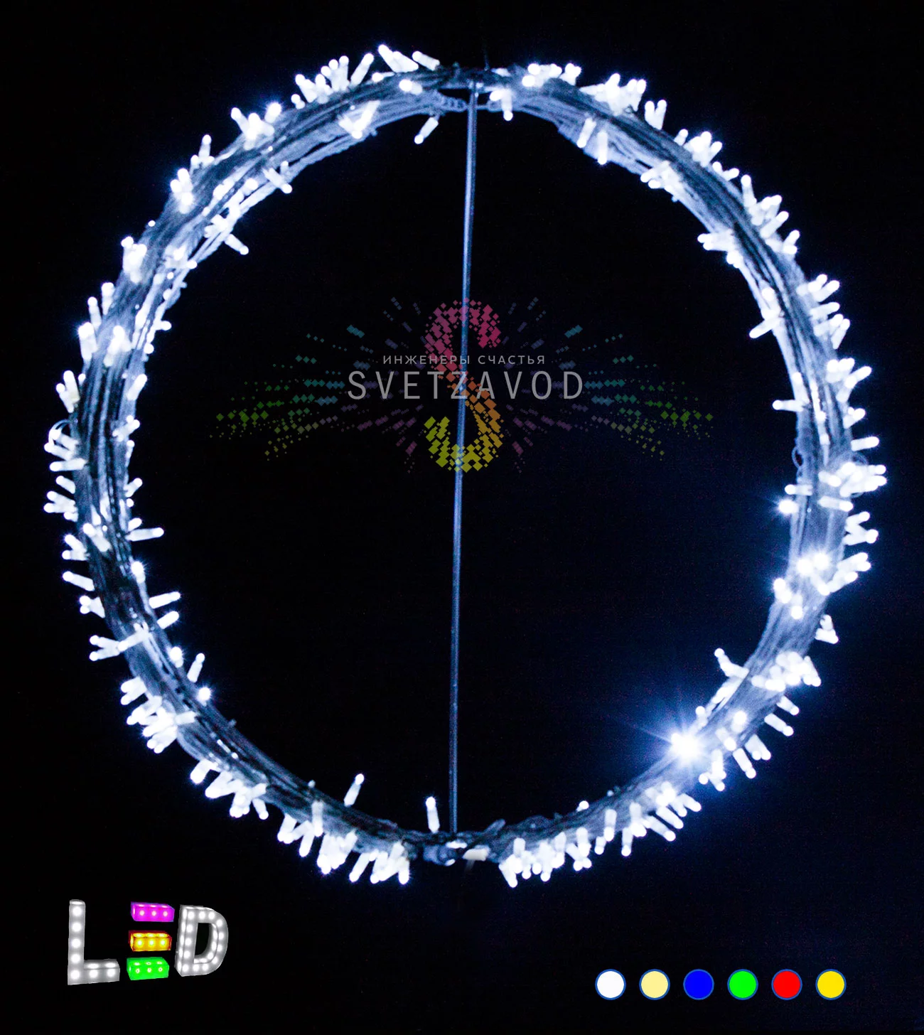 Шар создан для интенсивной эксплуатации. Его основа — прочный металлический каркас из 12 стальных дуг с порошковой окраской, который сохраняет форму при любых погодных условиях. На каркас намотана гирлянда типа стринг-лайт на каучуковом проводе с 50 светодиодами, защищенными колпачками.
