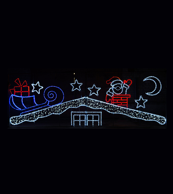 Создайте волшебную атмосферу праздника: Светодиодная перетяжка "Дед Мороз на крыше" — это готовое решение для эффектного новогоднего украшения улиц Москвы и других городов. Масштабная композиция (520х180 см) с главным зимним волшебником на санях с подарками станет центральным элементом праздничного оформления, привлекающим внимание и создающим неповторимое новогоднее настроение.