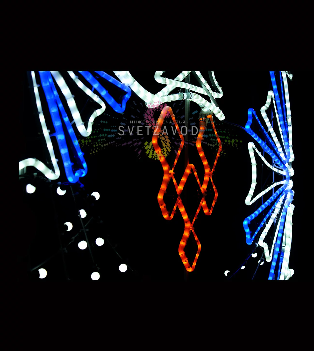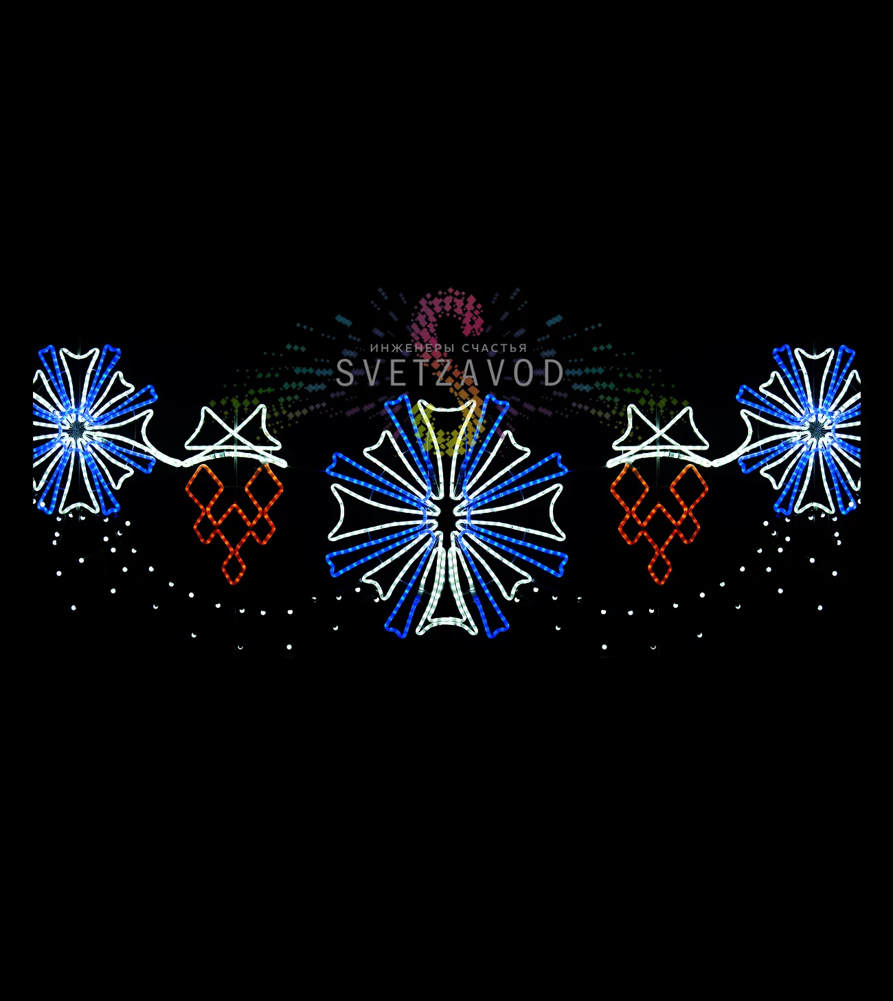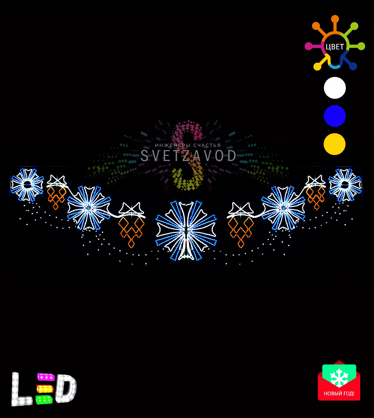 Универсальность: Крупный размер и яркое многоцветное свечение делают эту перетяжку идеальным инструментом для праздничного оформления городской среды и коммерческих объектов.
