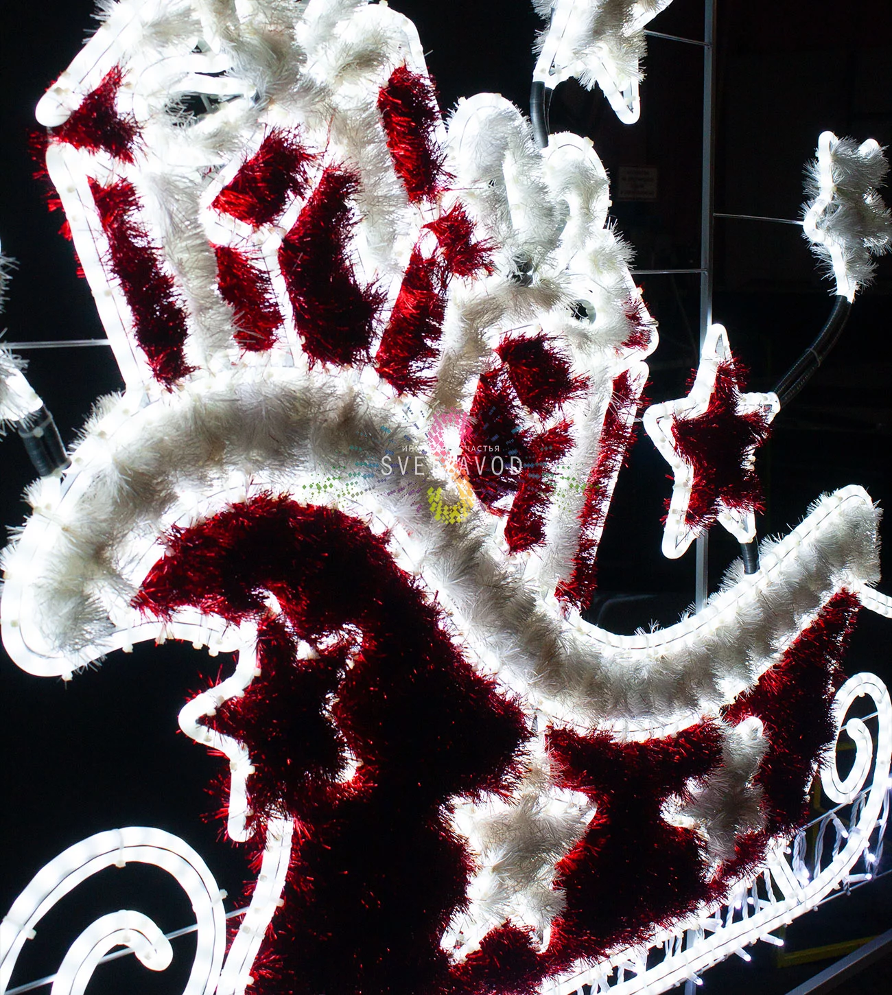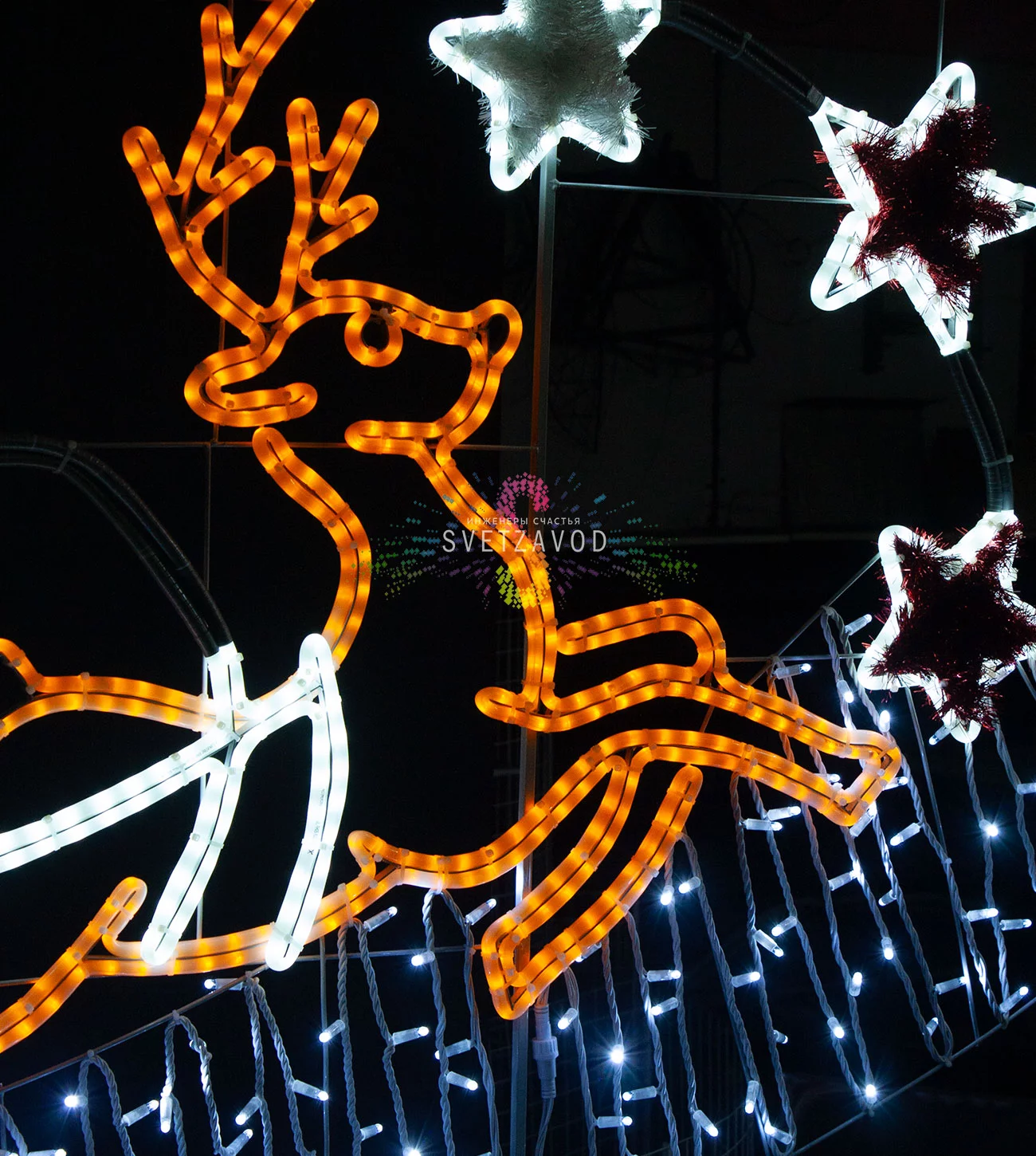 Проблема: Обычное праздничное оформление теряется в темноте и не создает должного эффекта. Решение: Масштабная светодиодная перетяжка "Сани с подарками" размером 5 на 1.5 метра. Это готовое решение для создания волшебной атмосферы и яркой точки притяжения взглядов. Закажите световые перетяжки для оформления городского пространства или коммерческих территорий.