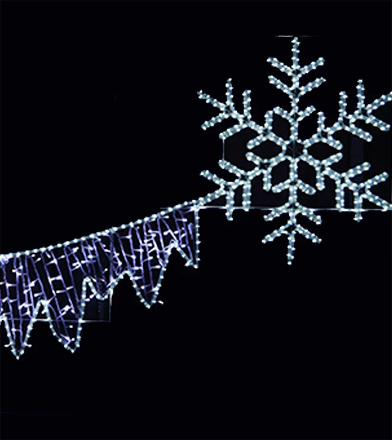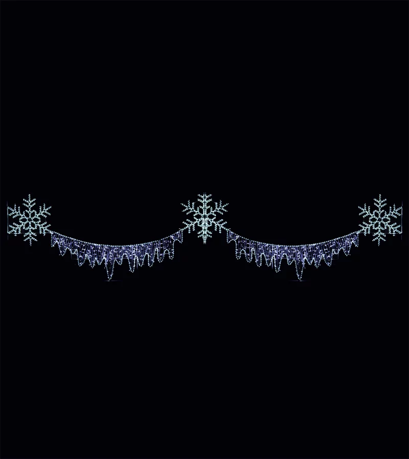Оформление городского пространства к Новому году требует ярких, заметных и надежных решений. Светодиодная перетяжка "Снег и лед" — это готовое решение для создания волшебной атмосферы. Композиция из трех светящихся снежинок и ледяных узоров из гирлянд белого цвета станет центральным элементом праздничного декора. Это идеальный вариант для новогоднего украшения улиц Москвы и других городов. Если вы ищете, где световые перетяжки заказать для муниципальных объектов или коммерческого оформления, эта модель отвечает всем требованиям по надежности и визуальному эффекту.