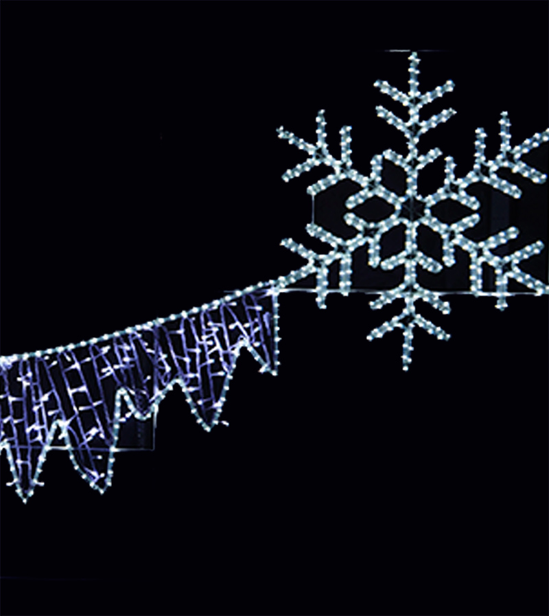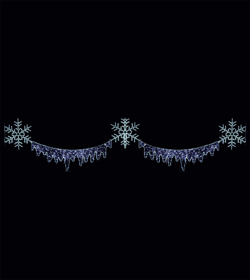 Инновационное новогоднее освещение: Светодиодная перетяжка "Снег и лед" создает волшебную атмосферу зимнего праздника. Композиция из трех изящных снежинок и ледяных узоров из световых гирлянд белого цвета станет ярким акцентом в городском декоре. Идеальное решение для новогоднего украшения улиц Москвы и других городов.