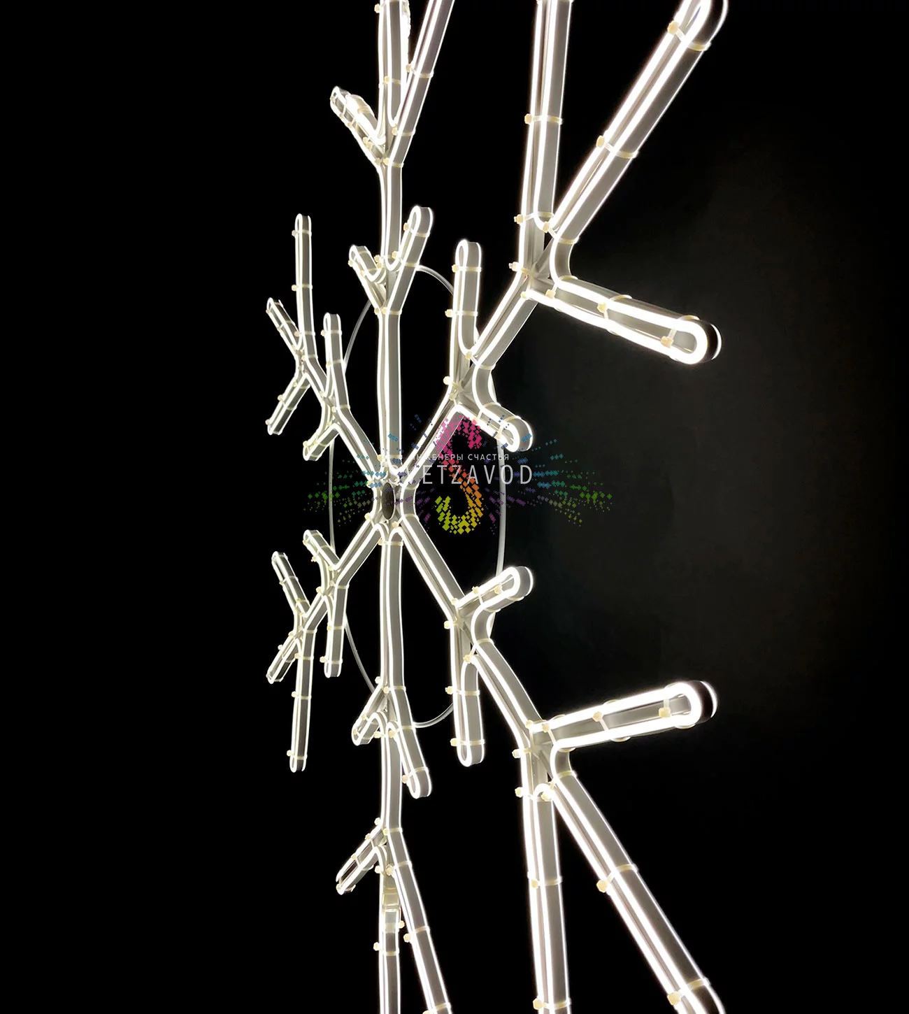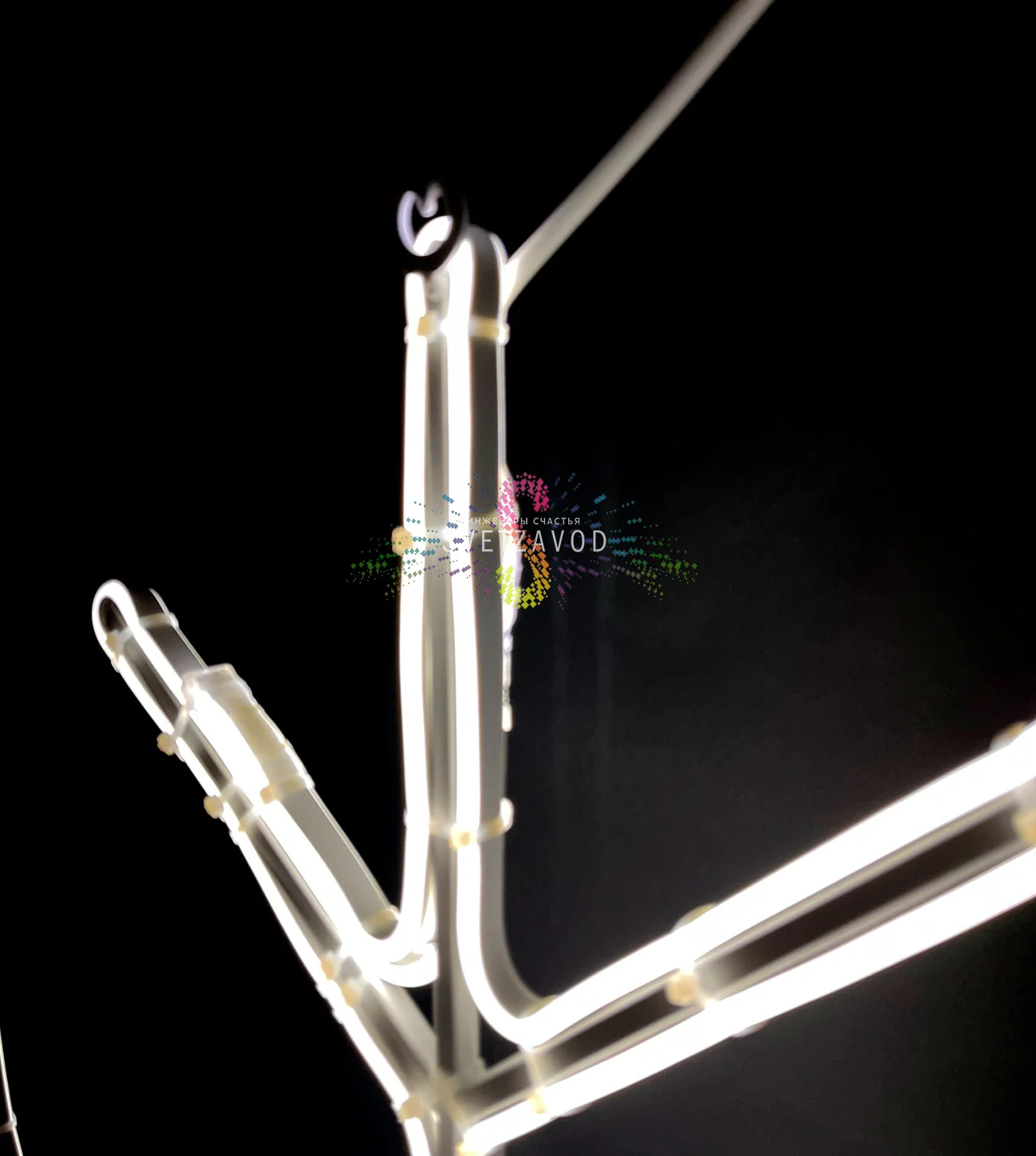 Технический разбор: Основу фигуры составляет прочный металлический каркас, который обеспечивает жесткость формы и устойчивость к ветровым нагрузкам. Световой контур выполнен из светодиодного неона (дюралайт), который дает равномерное свечение без точечных источников света. Все электрические соединения герметизированы для соответствия классу защиты IP65, что гарантирует работу при дожде и снеге.