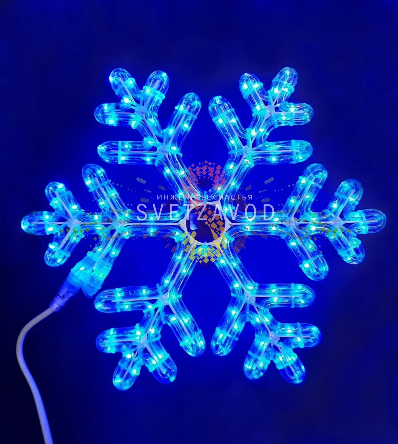 Снежинка изготовлена на прочном металлическом каркасе с антикоррозийным покрытием. Светодиодный дюралайт (144 диода) надежно закреплен и обеспечивает равномерное свечение без темных зон. Комплектация включает кабель с вилкой для прямого подключения к розетке 220В.